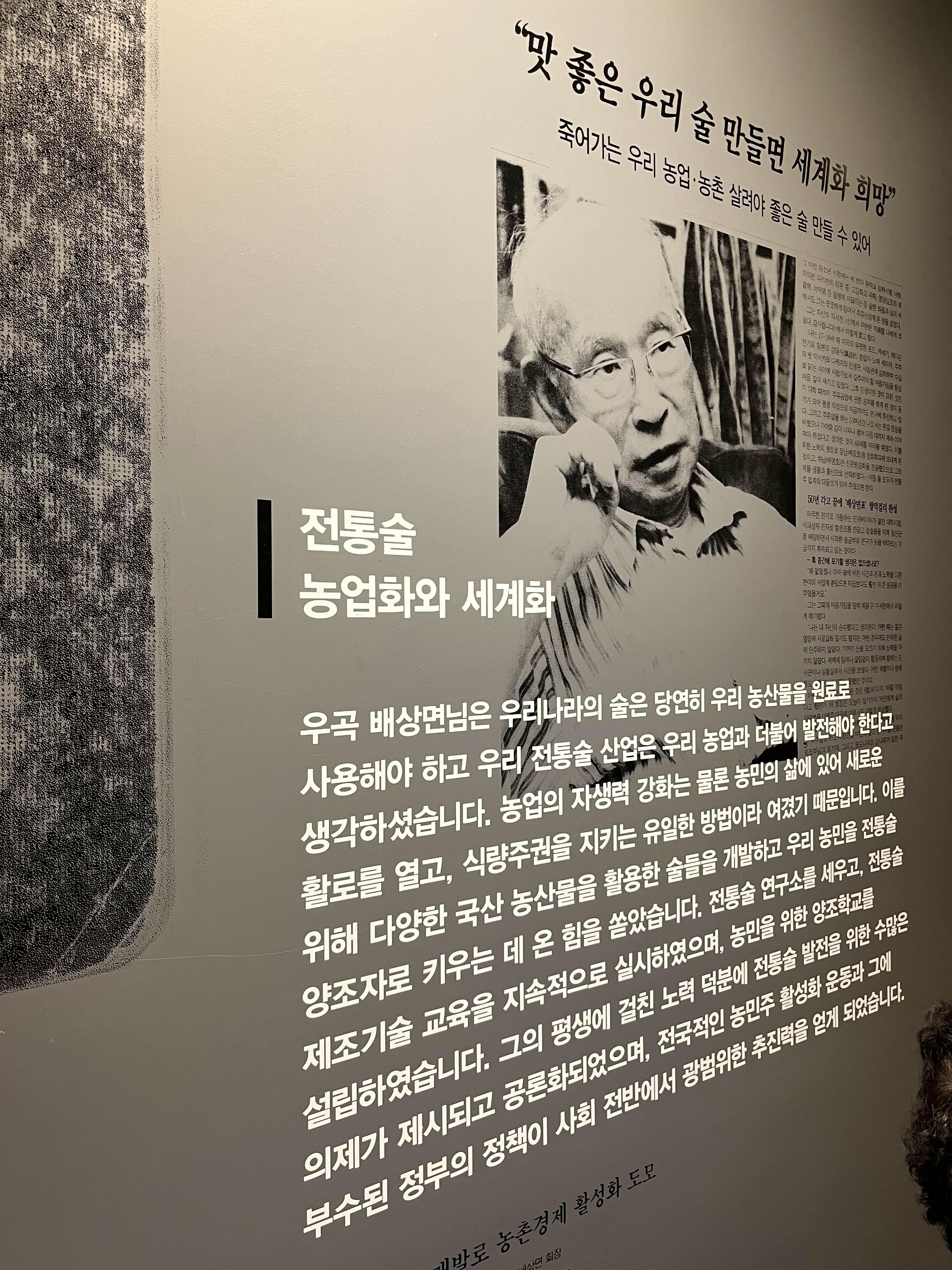 또한 내가 가장 마음에 들었던 곳인 ‘배상면주가’의 초대 설립자인 우곡 ‘배상면’ 선생의 발자취가 기록되어 있다. 우리가 흔히 생각하는 술만 빚는 ’명인‘이 아닌 본인의 업을 통해 사회의 긍정적인 영향을 미치고자 노력한 ’직업정신‘을 가진 자의 모습을 볼 수 있다.