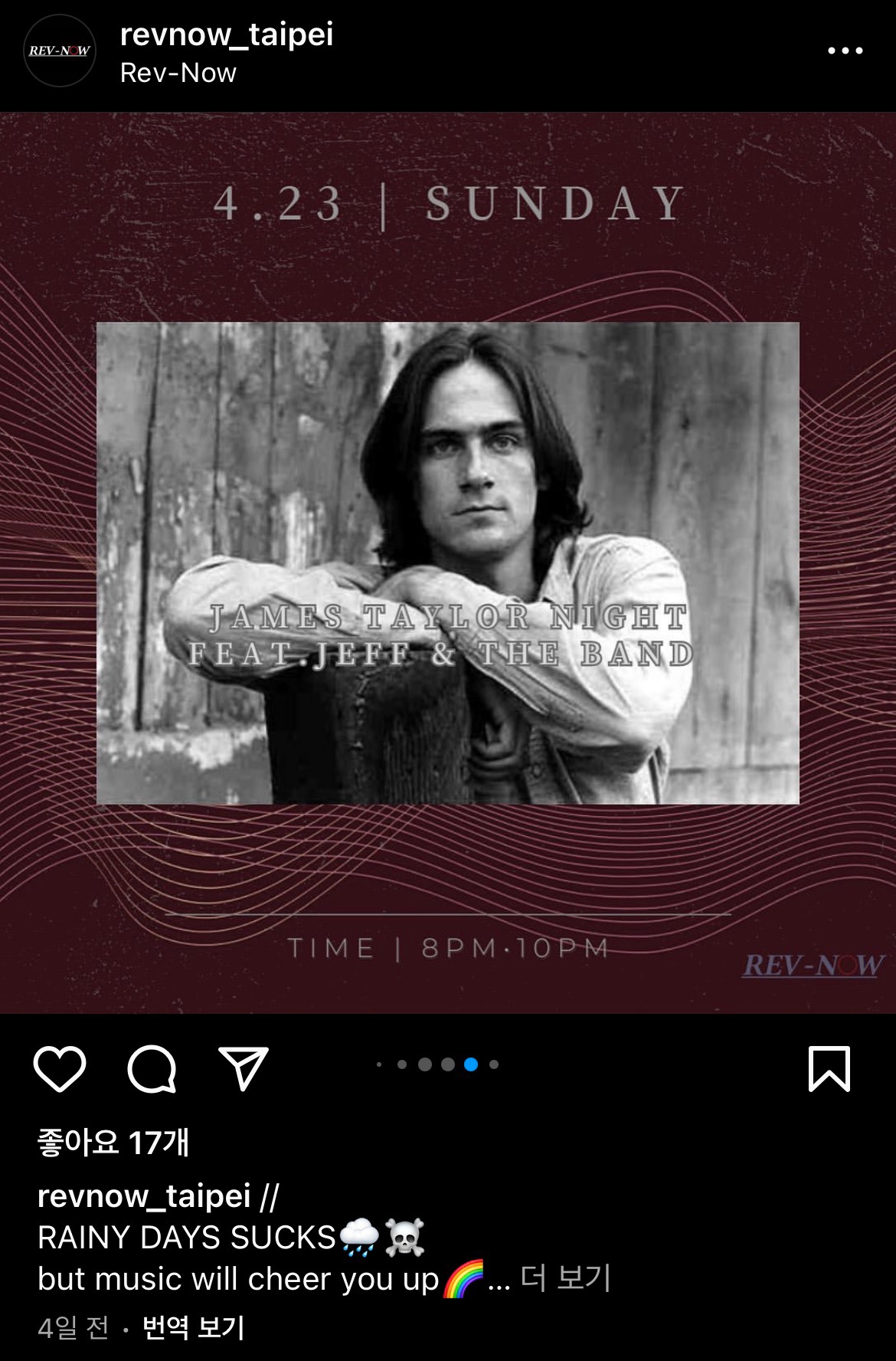 대만 여행의 마지막을 편안하게 보내기 위해 구글 지도로 'music bar'를 찾았는데 일요일이라 생각보다 문 연 곳이 별로 없었다. 맨 처음에는 techno 음악이 유명하다는 'Music room 23'을 찾아갔는데 입구에서부터 내 스타일의 노래가 아니라 안들어갔다. 그리고 지하철로 40분 거리의 재즈바, 'Rev-now'를 찾아갔다.