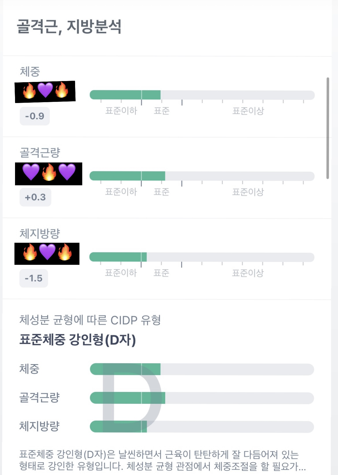 5월 마지막 주, 드디어 3달 간 준비했던 모든 시험들이 다 끝났다. 또 마침 가장 친한 친구가 광주에서 서울로 올라오고, 절친의 생일파티로 인해 한 3일간 미친듯이 놀았다. 그리고 그 뒤 이어지는 한 2-3일 간의 숙취와 귀차니즘으로 운동을 미뤘어서 인바디 재는 데 한 주를 미뤘다. 제대로 놀았으니 제대로 정신 잡기로 다짐하며 6/1-6/10일까지 하루도 안빠지고 운동을 했더니 다행히 체지방이 -2kg 정도 빠졌다.