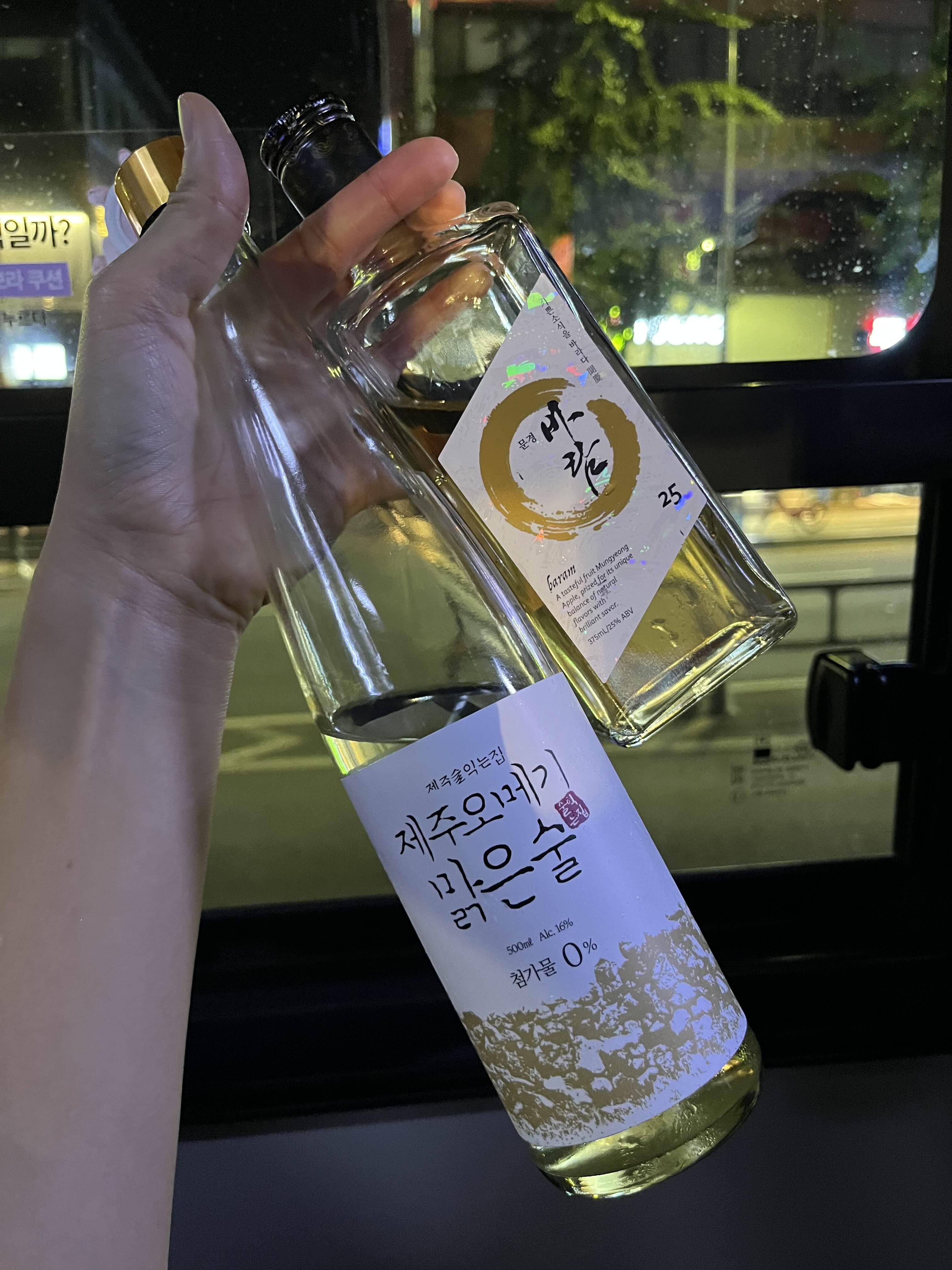 | 제주오메기맑은술 | 16도 | *향: 산미가 있는 누룩향. 약간의 식초향? *맛: 감식초 만큼 새콤함. 끈적한 새콤한 맛. 어떻게 쌀로 만든 술에서 이런 식초맛이 나는 걸까. 산미있는 감칠맛이 입 마무리를 해주는 게 좋았다. *바디감: 따를 때보니까 바디감 있는 느낌. 약간 끈적. |