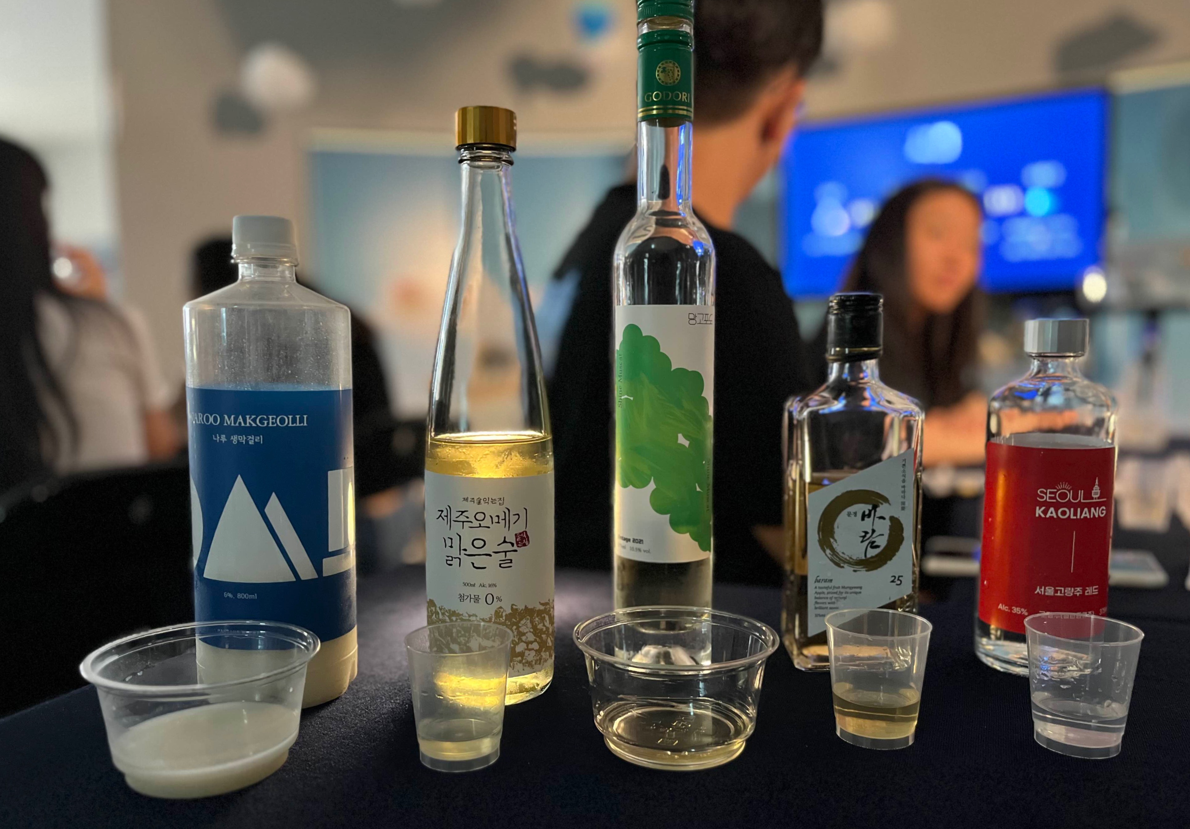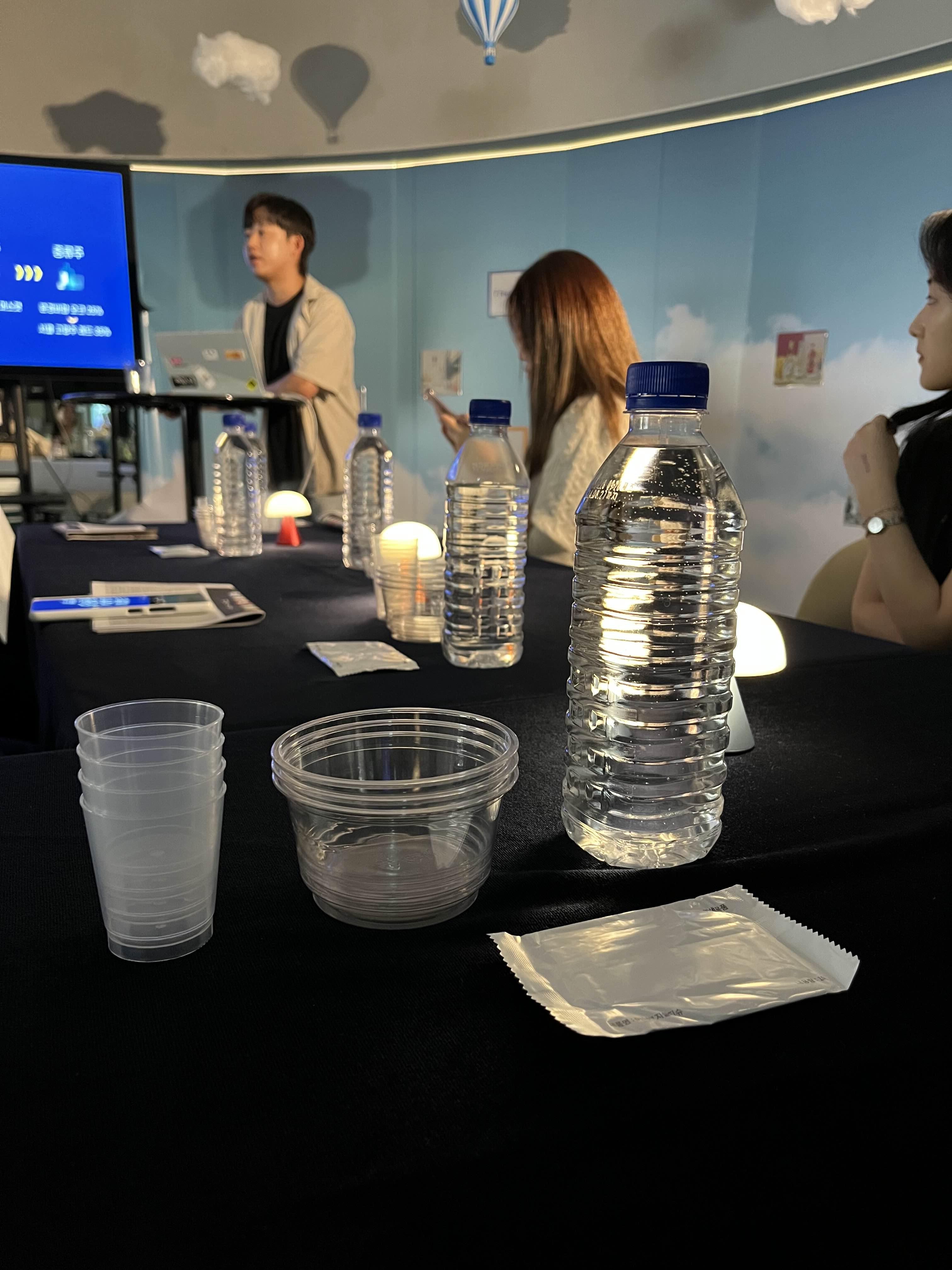 참가자들은 각각 개별 번호가 있는 자리를 부여받았다. 책상에는 물과 컵들이 정갈하게 정리되어 있었다. 소주컵 4잔과 아까 1free drink를 주었던 시음컵 3잔. 오늘 마실 술이 7종류나 되나? 생각하고 앞에 봤더니 시음주들이 놓여있었다. 실온과 얼음 바스켓에 보관되어 있었는데, 바스켓에 있는 건 보지 못했다. 실온에 있는 거 보니 '문경바람'과 처음보는 술. 기대됐다.