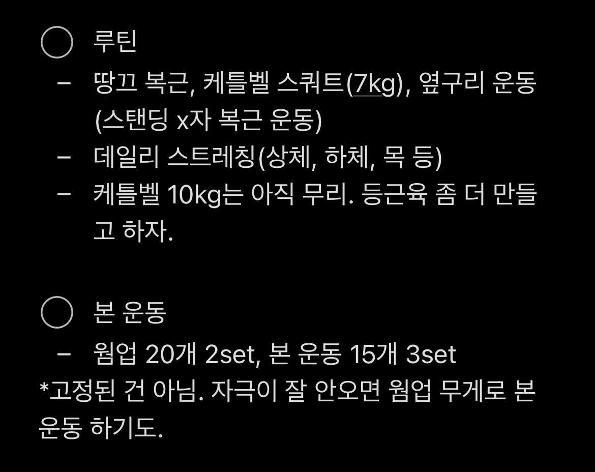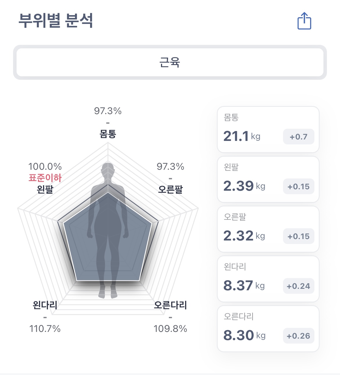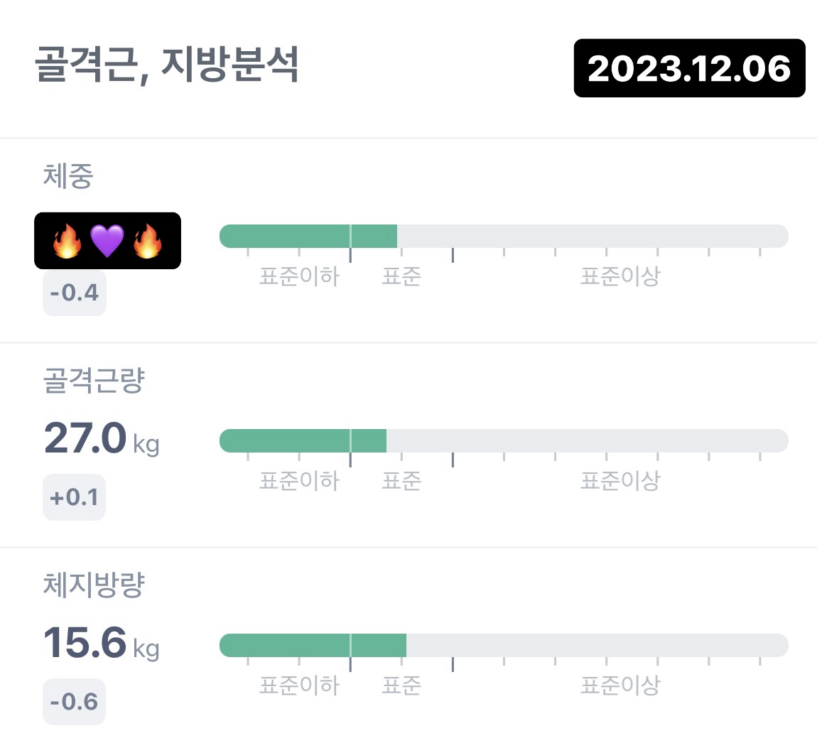 이 중 제일 마음에 드는 건 몸통 근육이 +0.7kg나 는 것. 신체 중 허리, 배 살이 제일 컴플렉스였고 땅끄부부 복근 루틴으로도 쉐잎이 잡히지 않는 것 같아 고민이었다. 그래서 최근 맨몸 운동 중 케틀벨 스쿼트에 무게를 늘리고, X자 복근 운동(정확한 이름 모름)을 했는데 효과가 있는 듯하다. 뿌듯. 앞으로 복근 운동 정착.
