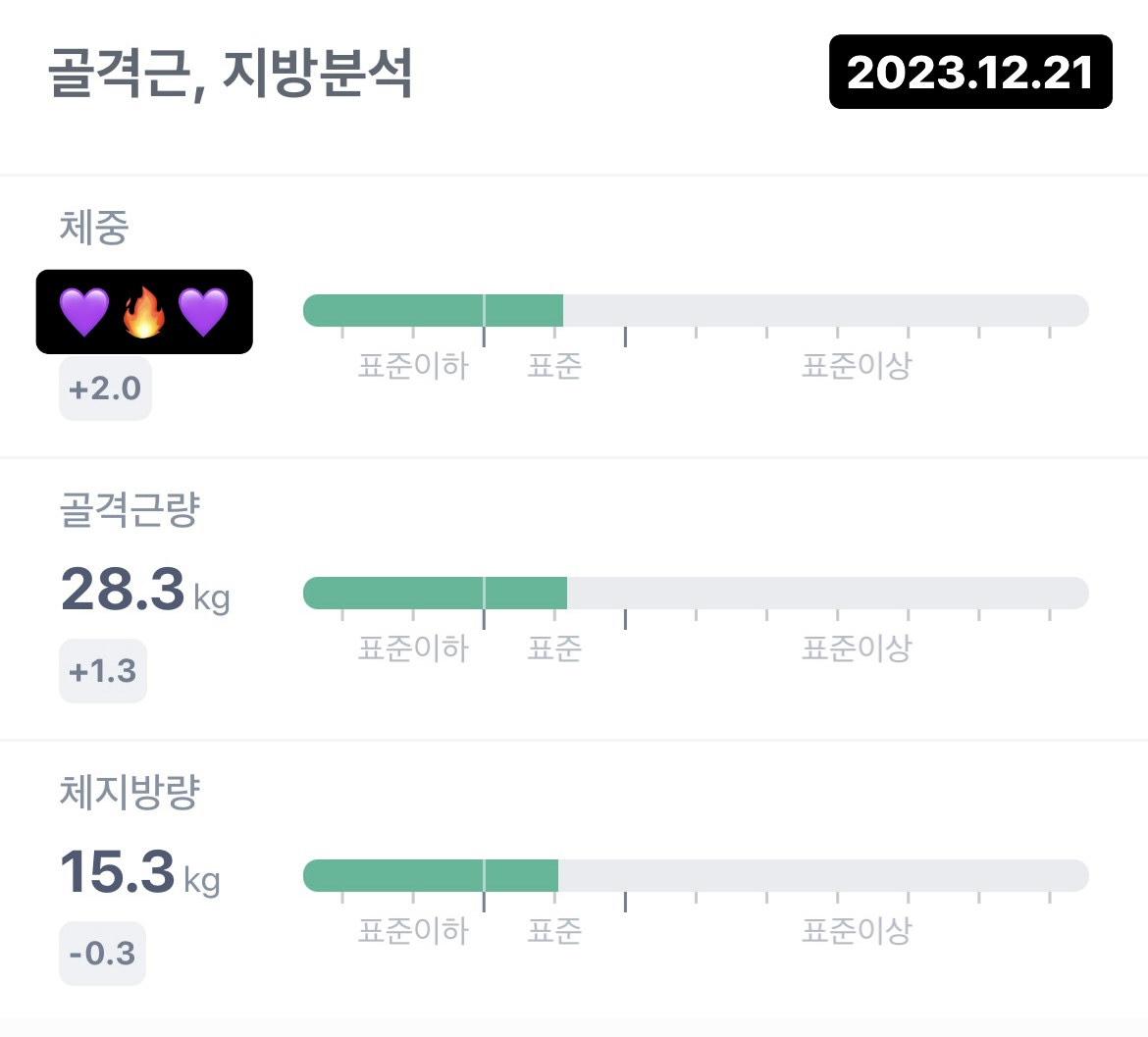 매일 눈바디 확인할 때마다 허리 군살이 다시 야금야금 느는 걸 봤지만... 운동하면 유지되겠지. 하는 안일한 생각으로 2주를 살았다. 그리고 결국 2kg가 쪘다. 다행인 건 먹은 게 다 근육으로 간 듯. 근육이 +1.3kg 찌고 체지방이 -0.3kg 빠졌다. 꾸준한 운동 덕분에 양심의 가책 50% 감면^^.