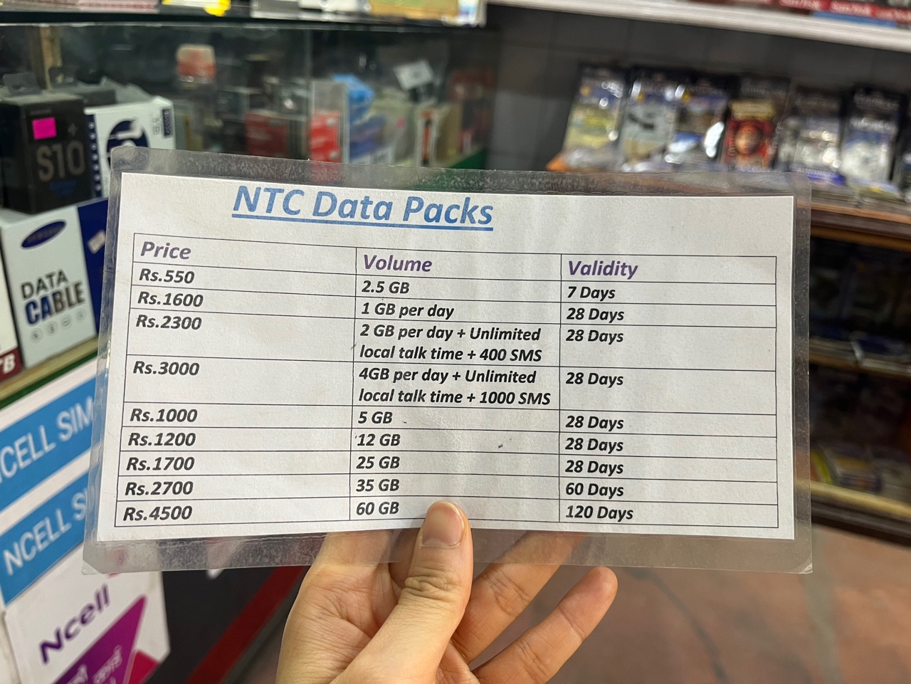 그 중 간신히 NTC USIM 판매처를 찾았고, 한 블로그에서 본 3000Rs보다 저렴한 2300Rs에 USIM을 구매했다.