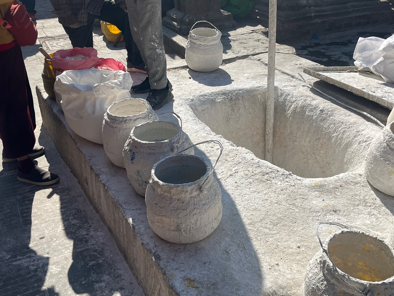 하얀 석탑 주변으로는 청동 종 모양으로 한 것들이 둘러쌓여 있고, 사람들이 그 종을 만지며 사원을 한바퀴 돈다.
