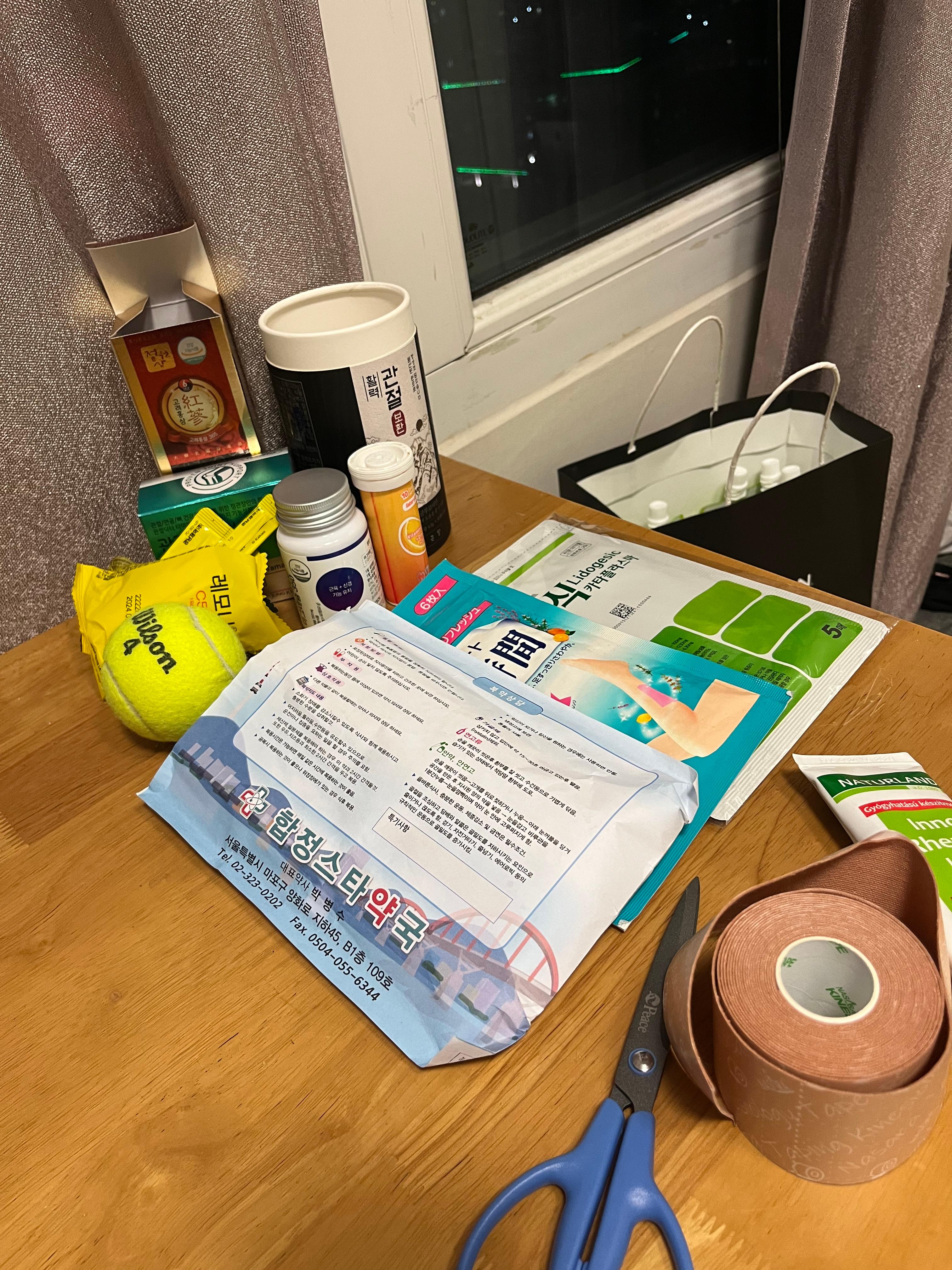 내일 아침 챙겨갈 것들 준비해놓다 문득 바라본 내 책상이 너무 어이없어서 사진 하나 찍었다. 평소에 하나도 챙겨먹지 않았던 건강보조식품들과 파스, 테이핑 테이프 등 ㅋㅋㅋㅋㅋ 나 정말 뛰고 싶나보다.