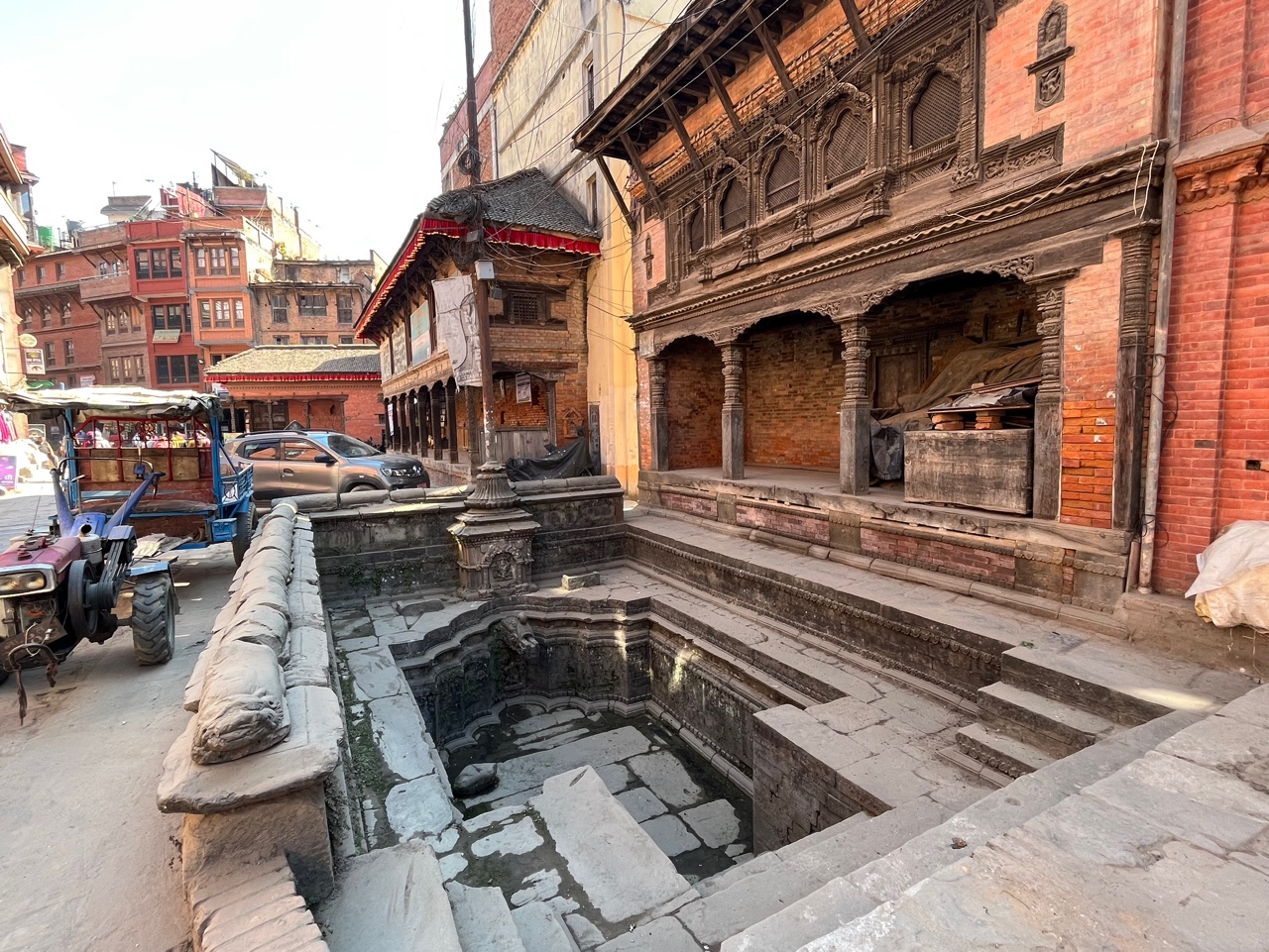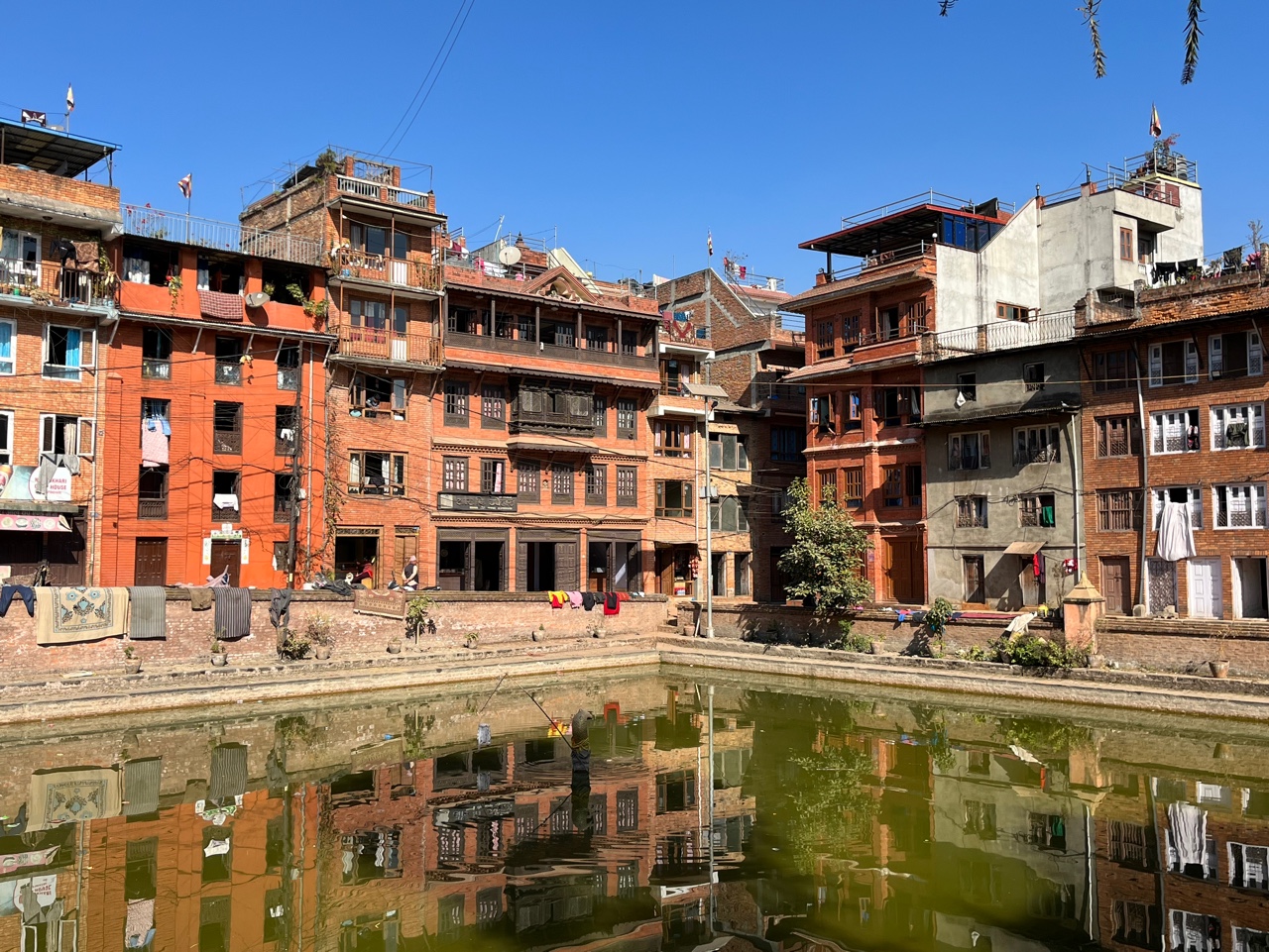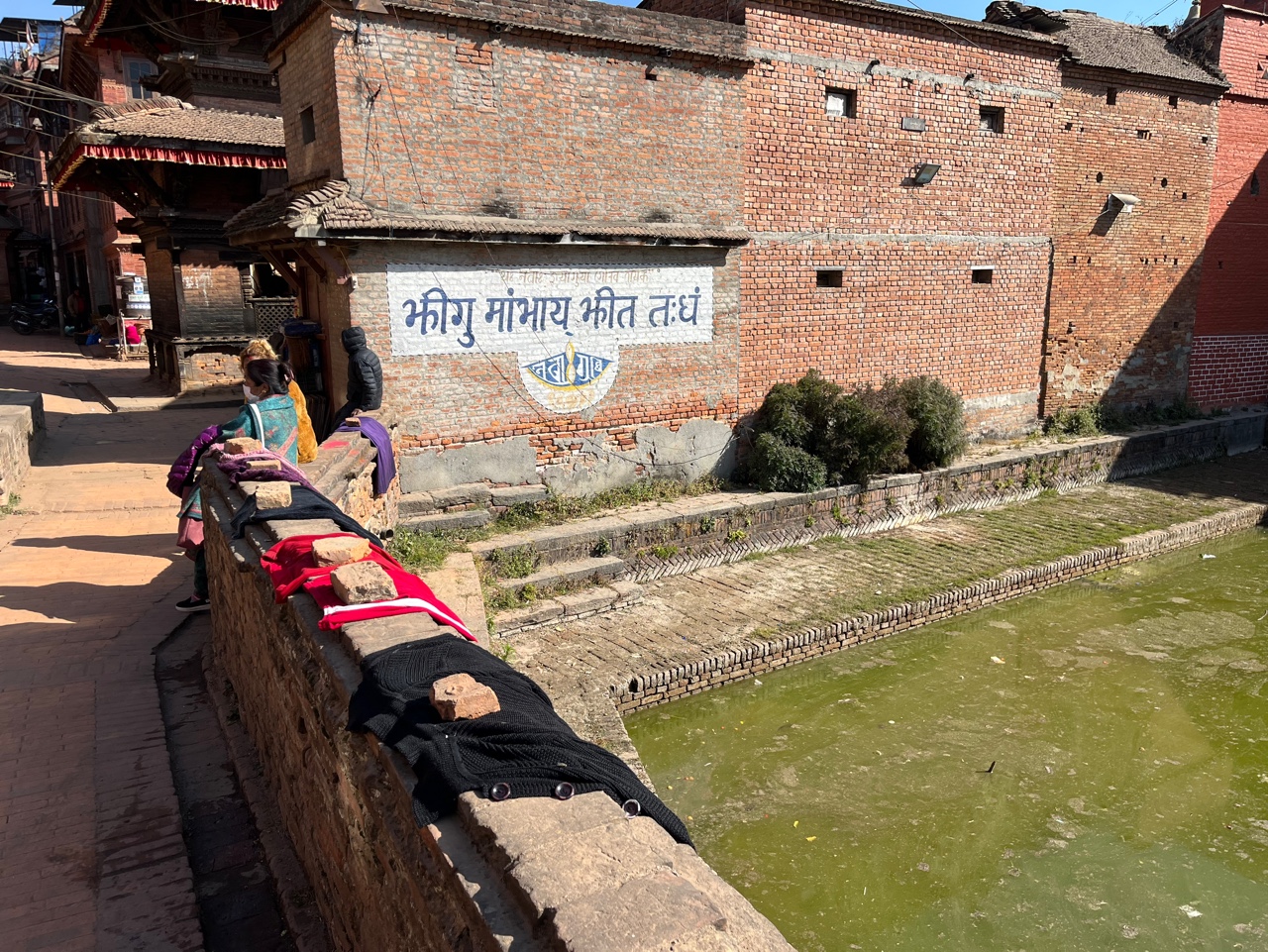 박타푸르 마을은 ㅁ자로 구성되어 있다. 건물들이 ㅁ자로 그 사이에 큰 연못이 있다. 15C, 그 연못은 사람들의 식수나 빨래터로 사용됐을 느낌. 지금은 녹조가 껴서 그 물을 실제로 사용하진 않는 듯하다. 그 주변에 빨래만 말리는 정도.