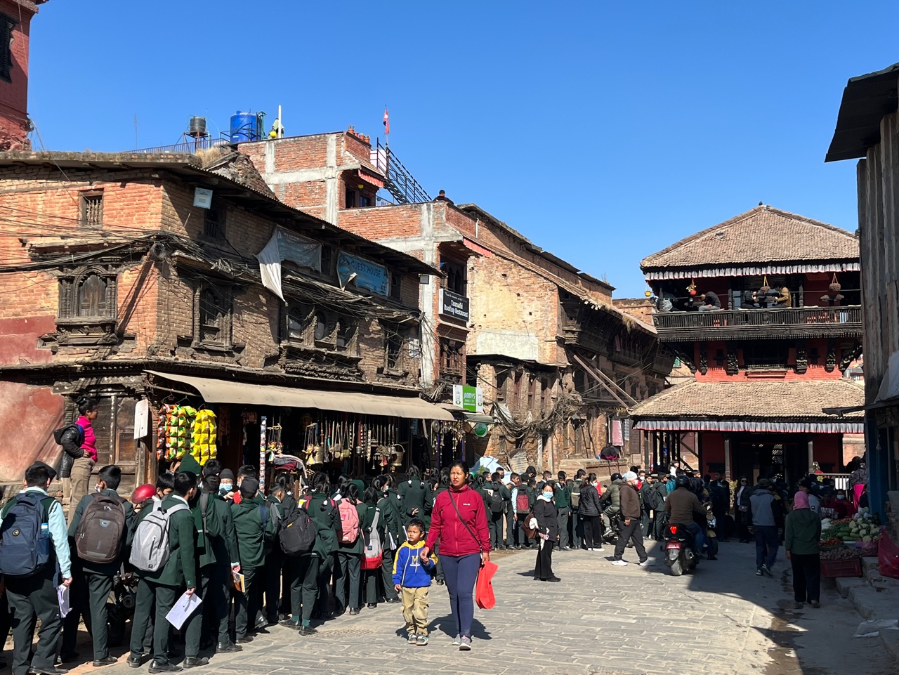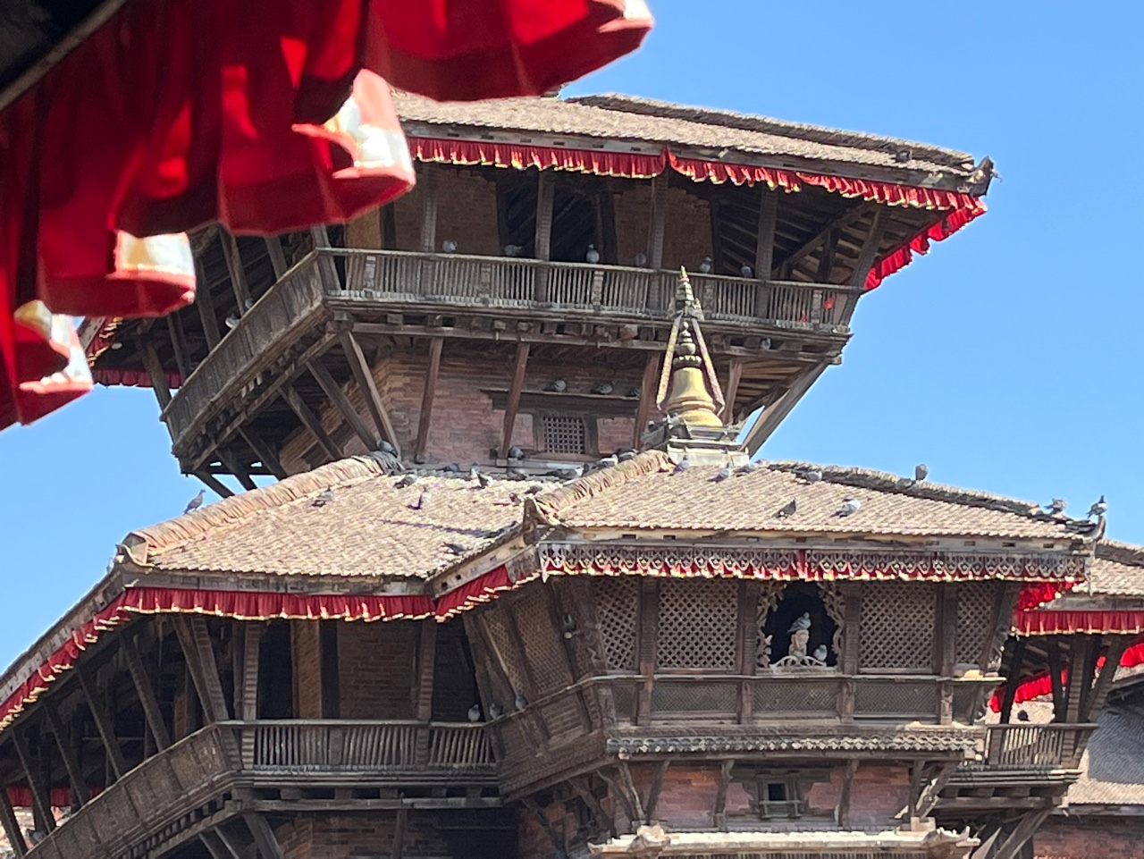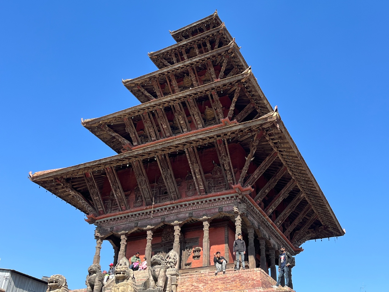 그리고 저 멀리서 보이는 웅장한 건물. 박타푸르 더르바르 광장의 건물이다. 우리나라와 달리 지붕을 여러 층으로 쌓고, 아래층에서 윗층의 지붕을 지지하는 나무를 대각선으로 연결하는 게 네팔(혹은 말라왕조)의 전통 건축 양식인 듯 하다. 사진에는 안담겼지만 지붕을 지지하는 저 대각선 나무기둥의 조각들이 정말 디테일하다. 우리나라로 치면 조선시대 때, 어떻게 저렇게 디테일한 조각을 할 수 있었을까.