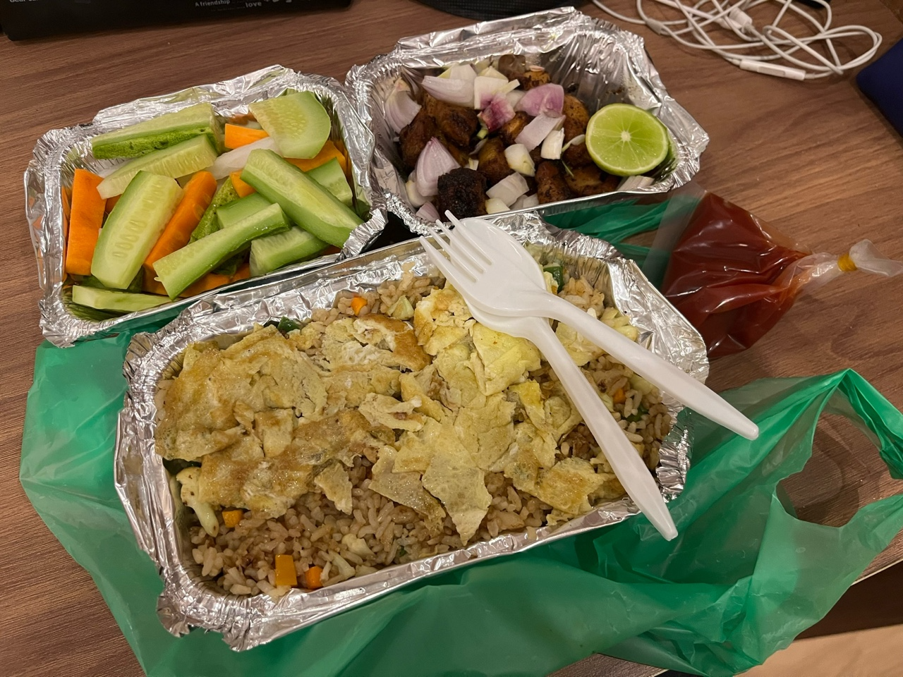 카트만두에서 밤에 나가는 건 처음이지만, 배고프면 사람이 용감해진달까. 모자와 바람막이로 몸을 무장하고 밖에 나갔다. 그리고 내가 사온 저녁. 네팔 현지 음식 'Pork Sekuwa'와 계란 볶음밥과 그린샐러드.