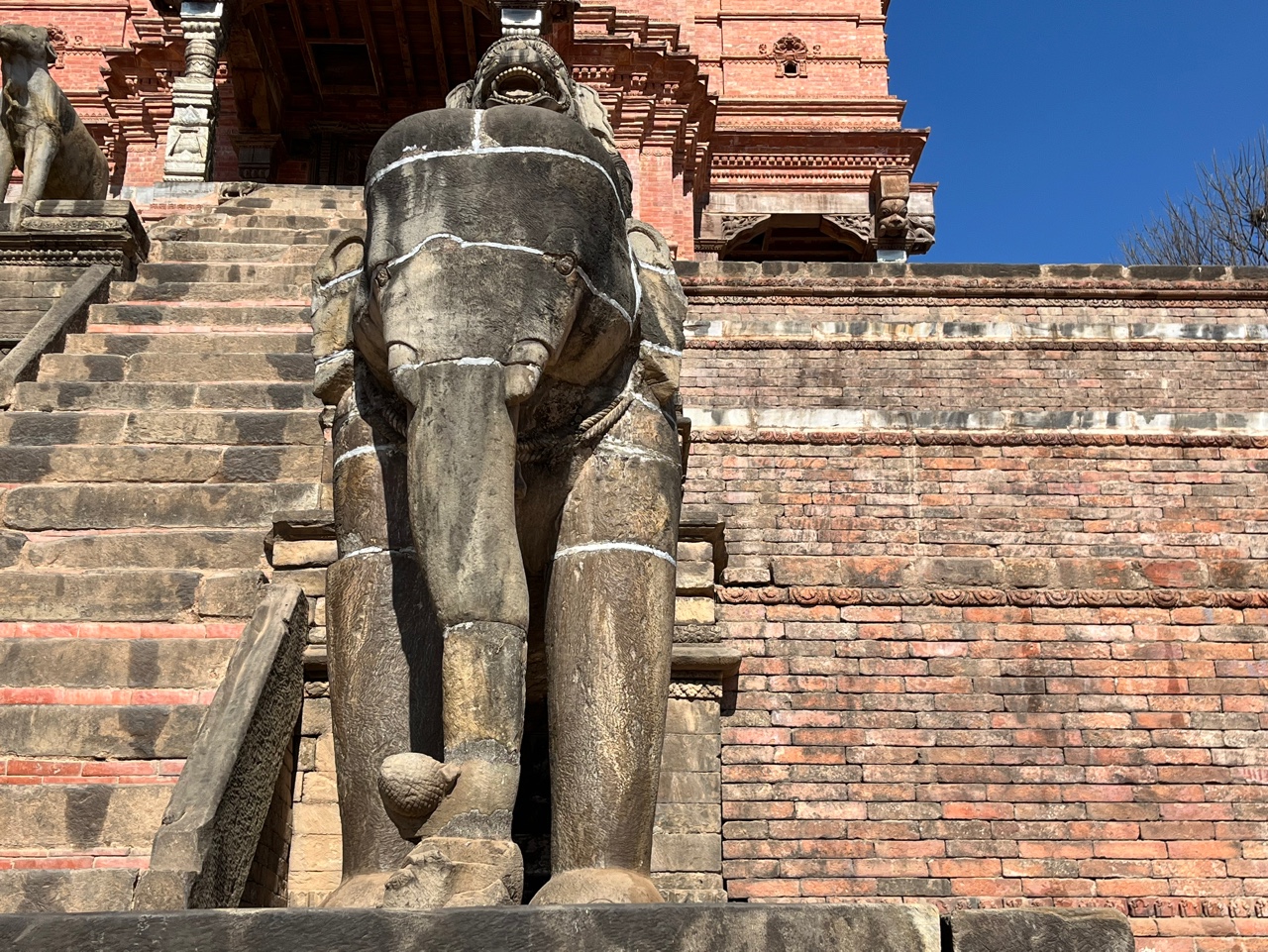 이 건축물 뒤로 조금 가면 또 다른 작은 광장이 하나 나온다. 여기는 방금 전 봤던 목조 건축물이 아닌 핑크색의 원형 석탑 건물이 나온다. 어떻게 이렇게 전혀 다른 건축 스타일의 건물이 한 공간에 있을 수 있을까? 말라왕조 때가 아니라 다른 시대일 수도 있지만...^^ 여기 역시 석조 계단 위에 건물이 건축되어 있는데, 계단마다 석조 동물 조각상들이 있다. 경복궁에 가면 보이는 우리나라 해태처럼 수호신 느낌인데, 가까이서 보니 동상에 금이 가있고 그 사이가 시멘트로 메꿔져있다. 지나가던 사람이 얘기하기를, 2015년 지진 때문이라고 한다.