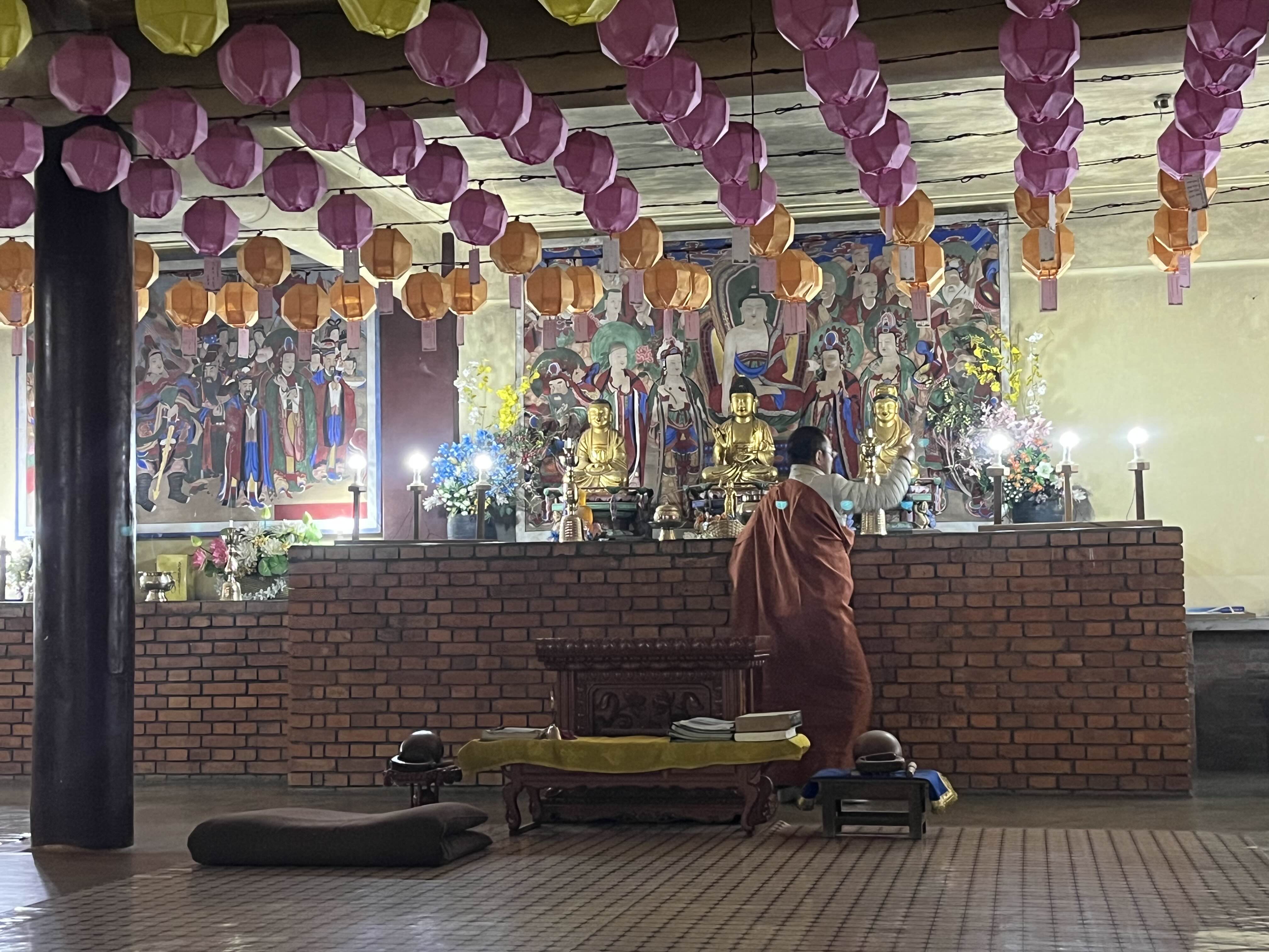 7시에 만나 식당 위 2층 한 방으로 가니 정말 한국 절이 있었다. 조금 늦어 방석을 가지고 호다닥 앉아 자리를 잡고 스님의 염불소리에 맞추어 30분 정도 명상을 했다.