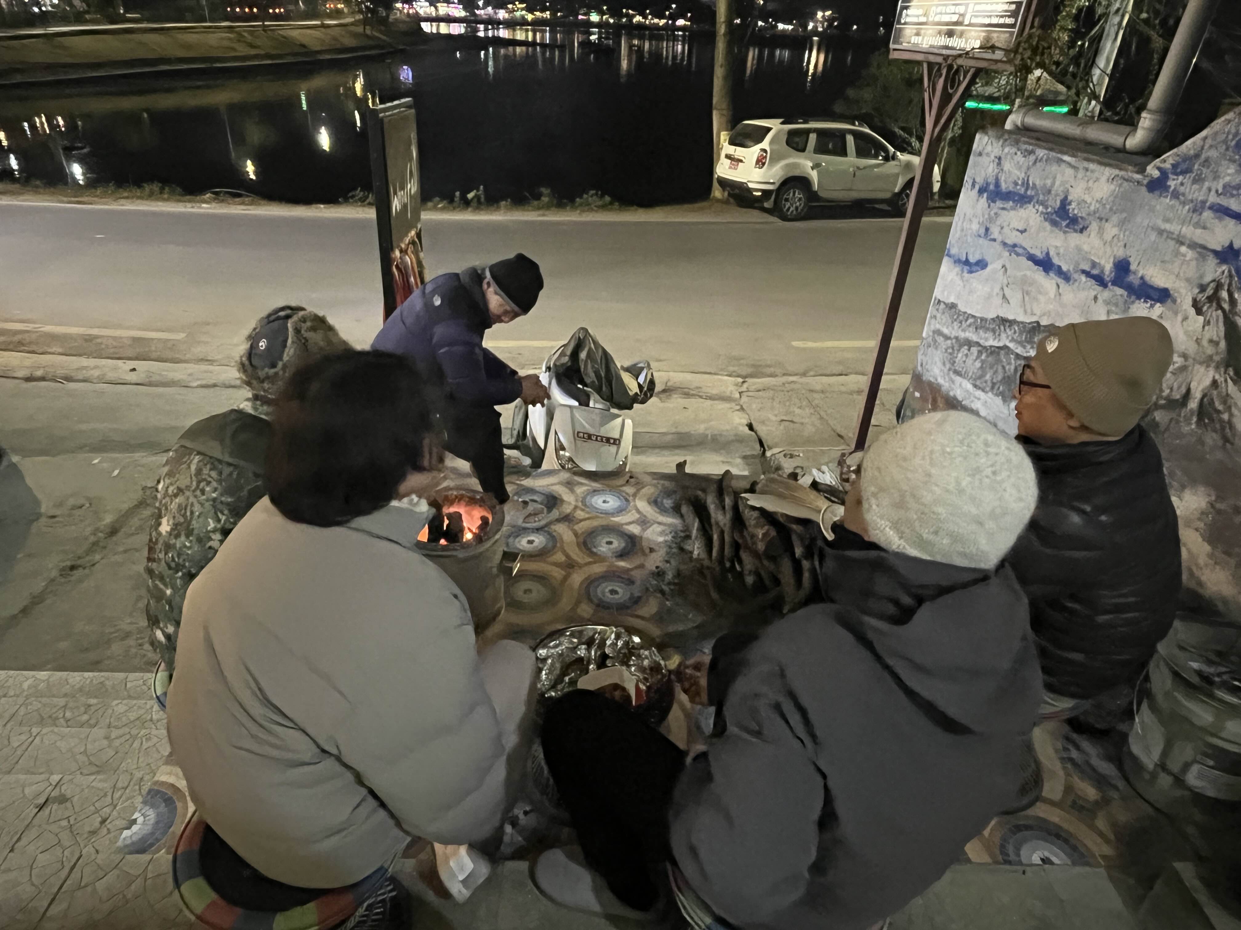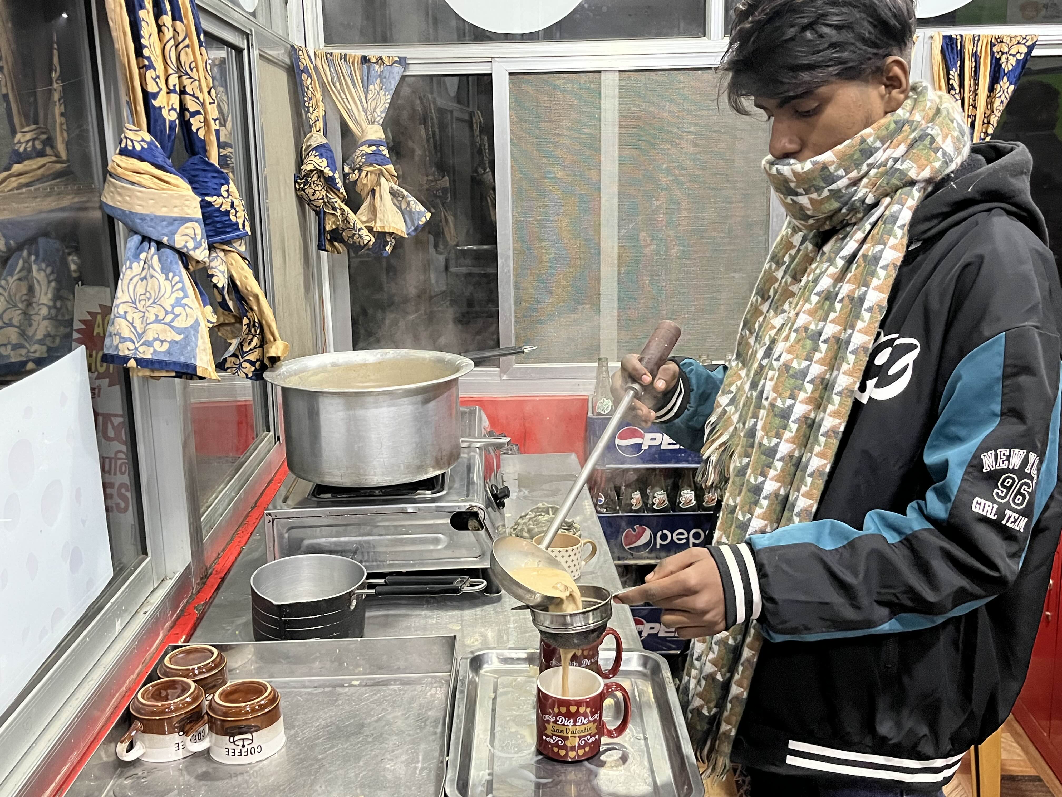 일찍 도착해도 차 문을 열어주지 않아 주위를 돌아보니 이 이른 시간에도 카페가 열었다. 대부분 탑승객들이 그 안에 오밀조밀 아침 먹는 중. 나도 네팔에 와서 좋아진 짜이티를 한 잔 시켰다. 놀랍게도 짜이티는 큰 냄비에 끓여서 건더기를 걸러서 주는 거였어! 어쩐지 곡물의 고소함이 있더라니.