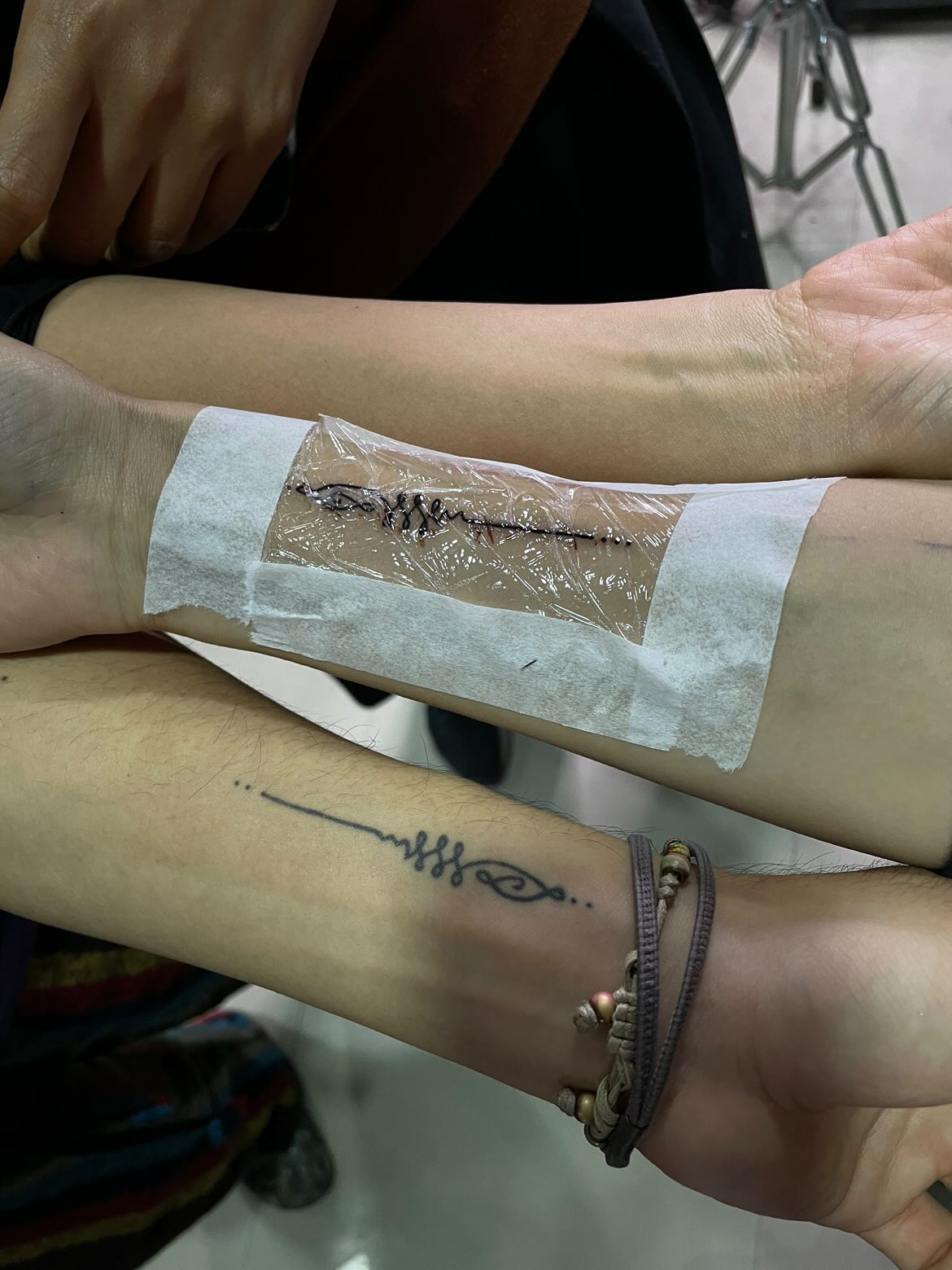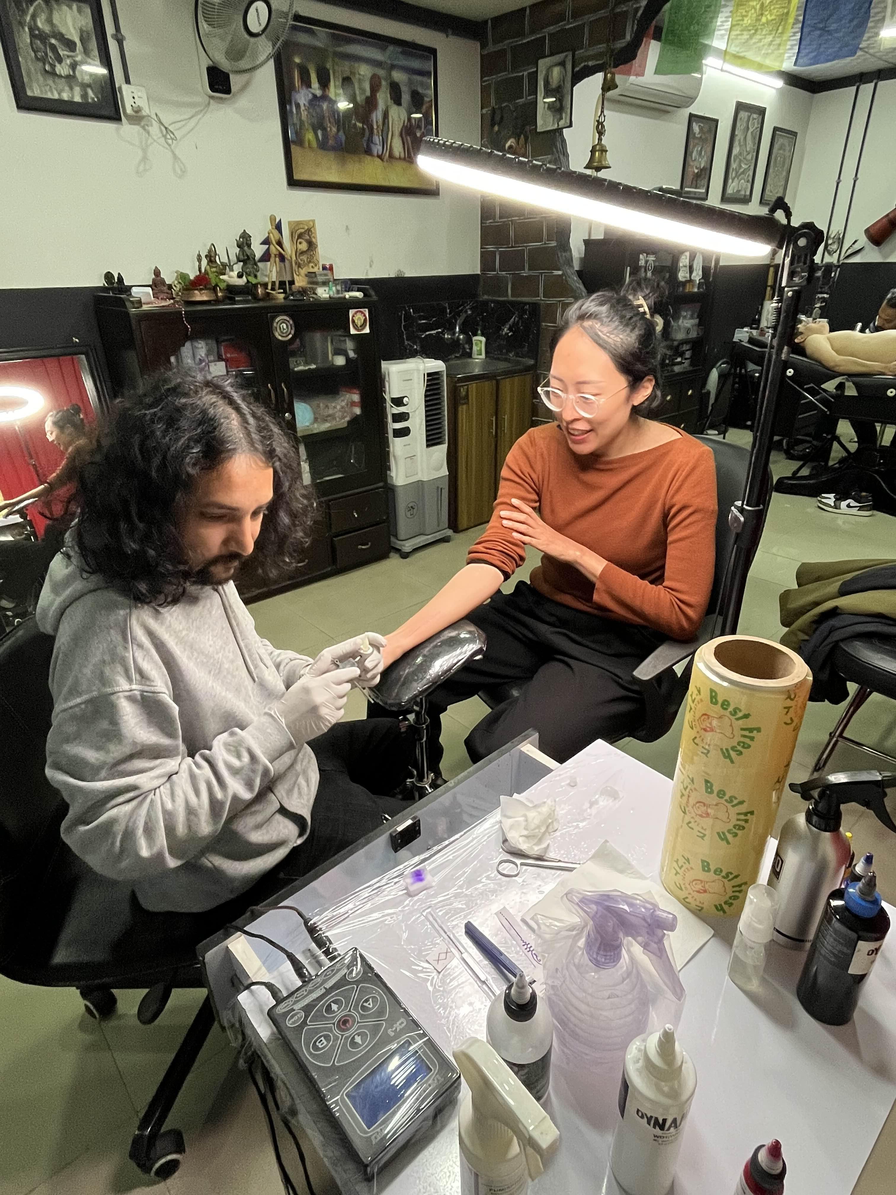 나는 손목과 귀 뒤 타투 2개 6,000루피로 네고했다. 원래는 바늘을 1개만 써야하기 때문에 손목에만 해도 6,000루피라고 했는데 같이 간 동생이 네고의 왕... 그럼 작은 거 하나는 더 얹을 수 있냐고 해서 우리 둘 다 손/팔뚝 + 각자가 원하는 위치에 작은 타투 한개 씩 추가해서 6,000루피로 쇼부봤다. 든든!