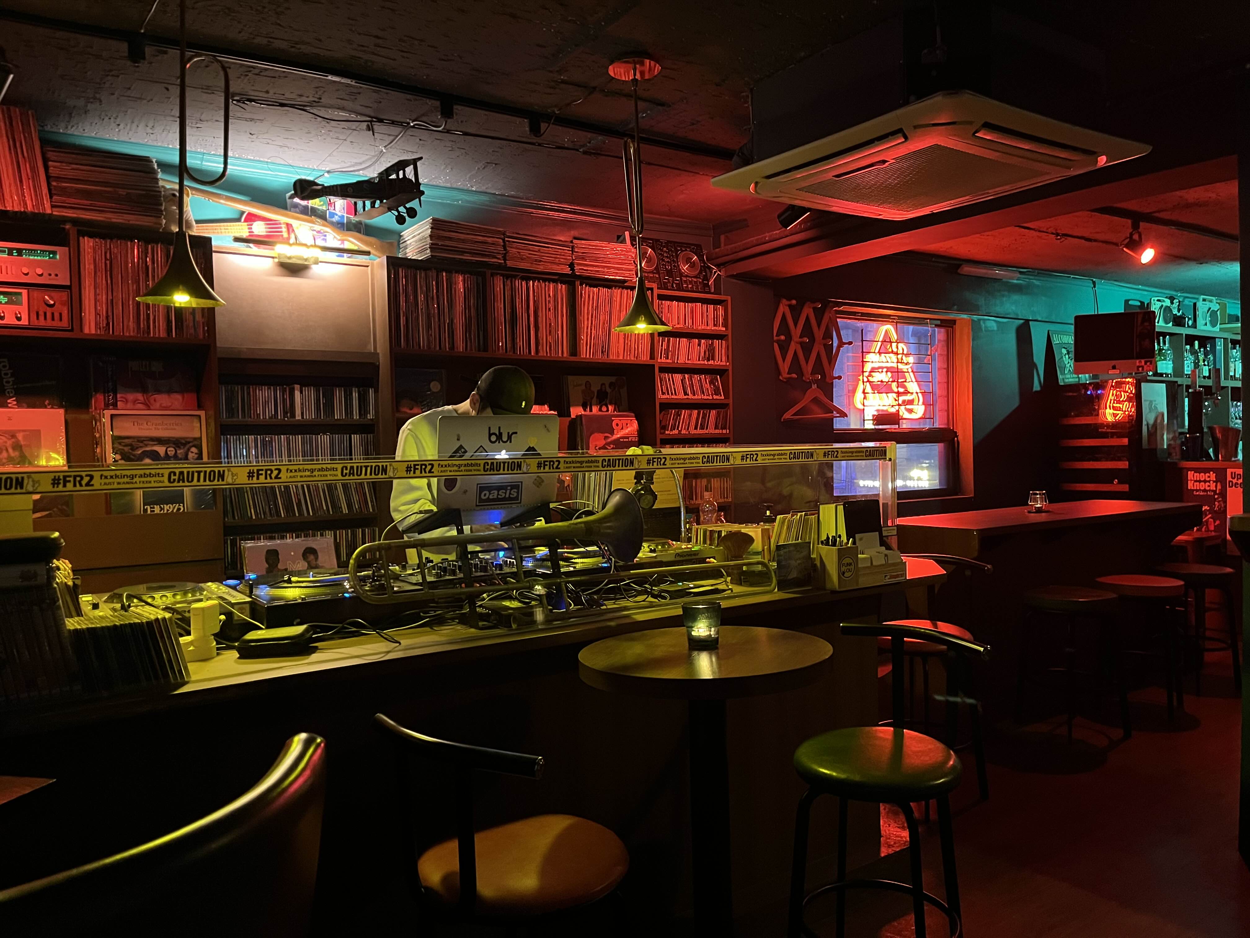 공간은 재밌다. 뭔가 80년대와 현재가 공존하는 느낌...? 외관에서 보이는 유리 네온사인도 그렇고, 내부 테이블/의자도 옛날 느낌. 그런데 계산대 지나서 들어오면 가운데 LP장과 DJ 부스가 있음.