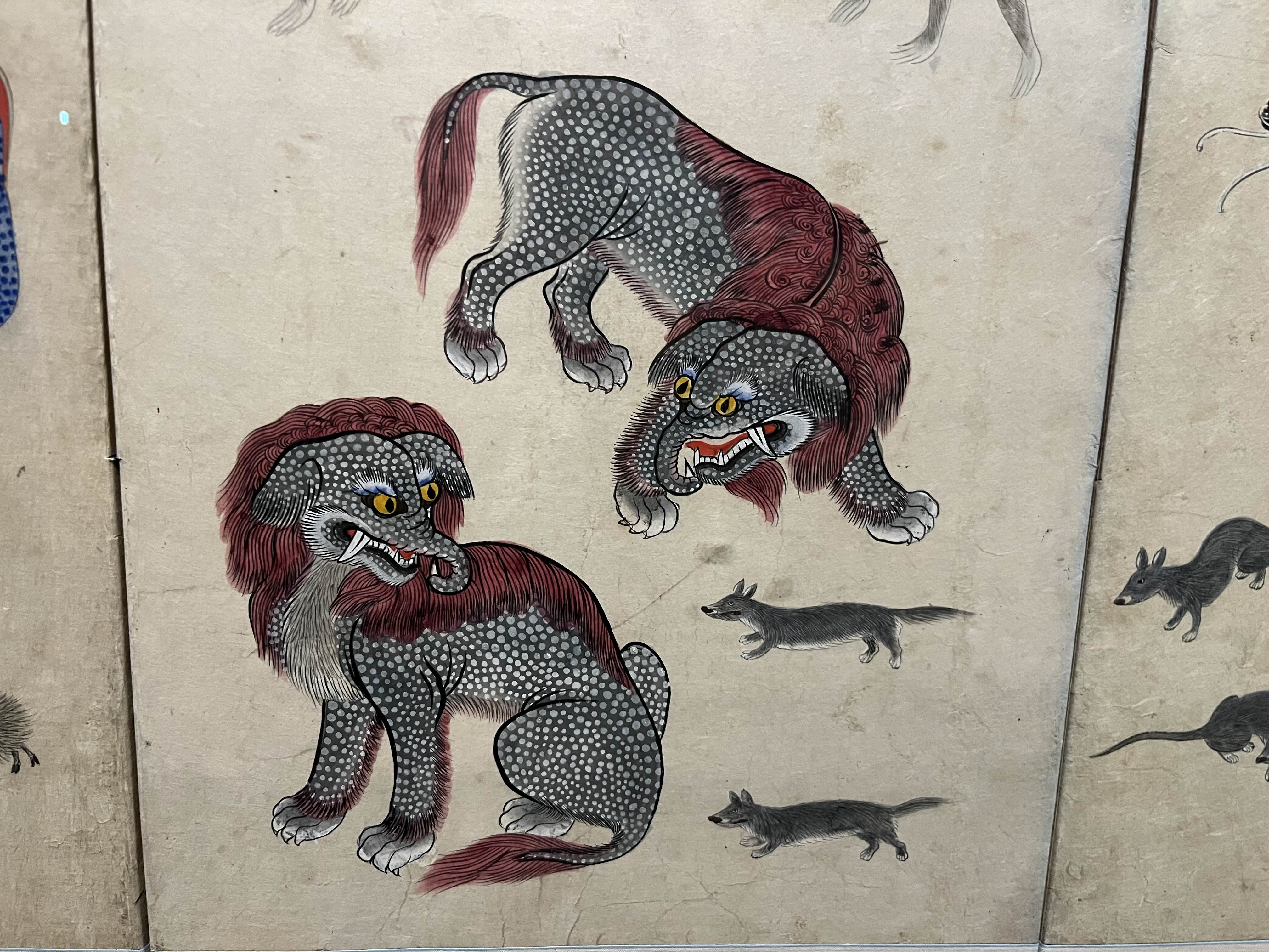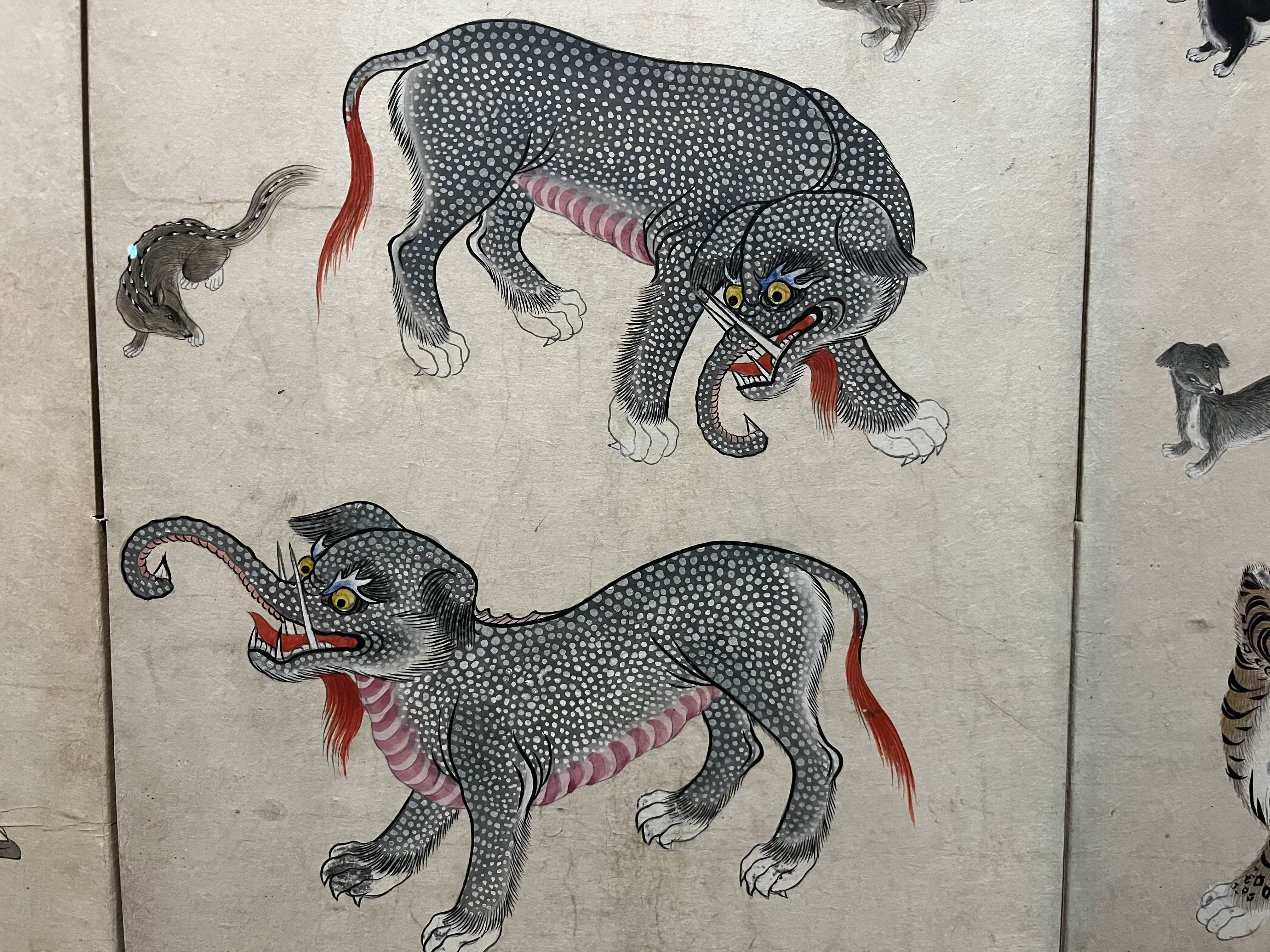 병풍에는 ’무병장수’ 혹은 ‘재물‘을 기원하기 위해 십장생 동물들이나 여러 환수종들이 자주 등장한다. 그 상징들을 그림 연습한 병풍을 보면 위에 처럼 특이한 생전 처음보는 동물들이 등장한다. 좋은 의미를 가진 외국 동물들을 소문에만 의존해 그리다보니 이런 재미있는 모습이 나온 듯하다 ㅎㅎㅎㅎ 귀여워.
