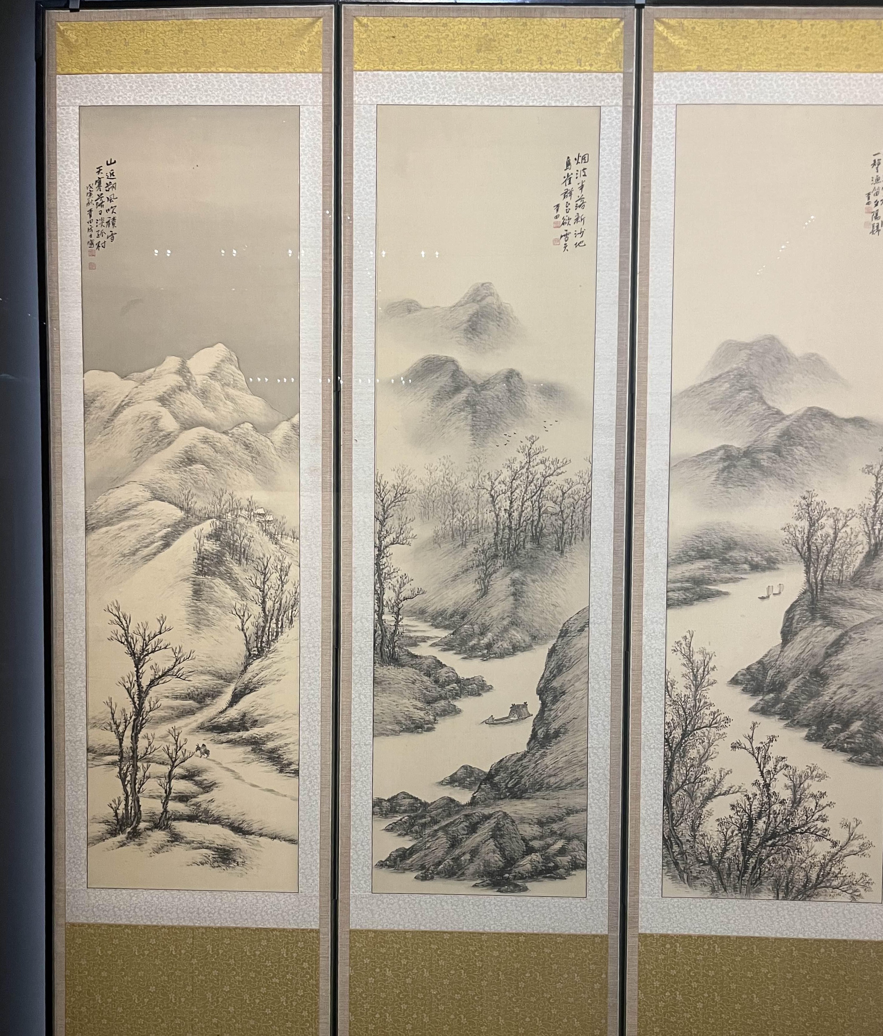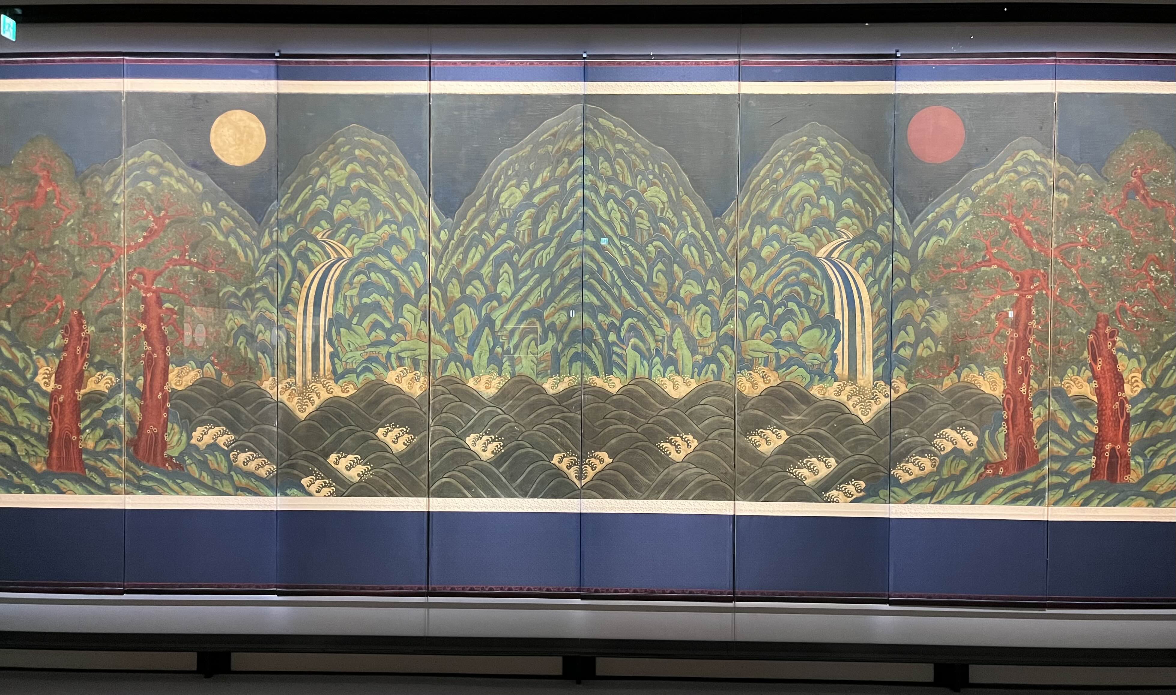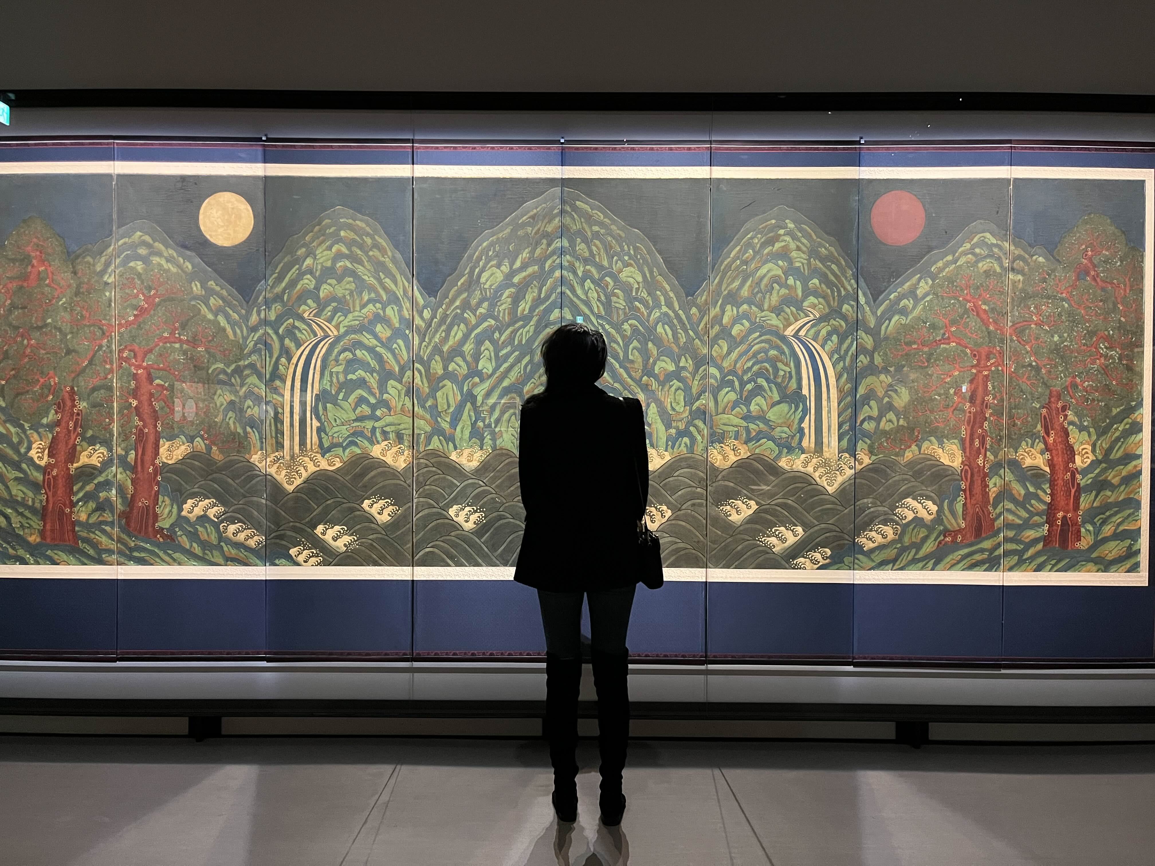 특히 이 마지막 병풍은 정말... 사계절의 자연의 모습을 10첩 병풍에 그린 건데, 마지막 겨울 산이 미쳤다. 그 전의 계절에서는 채색으로 산을 표현했다면, 겨울 산은 테두리를 채색해 눈 덮힌 설산을 표현했다. 진짜 너무 멋있어...