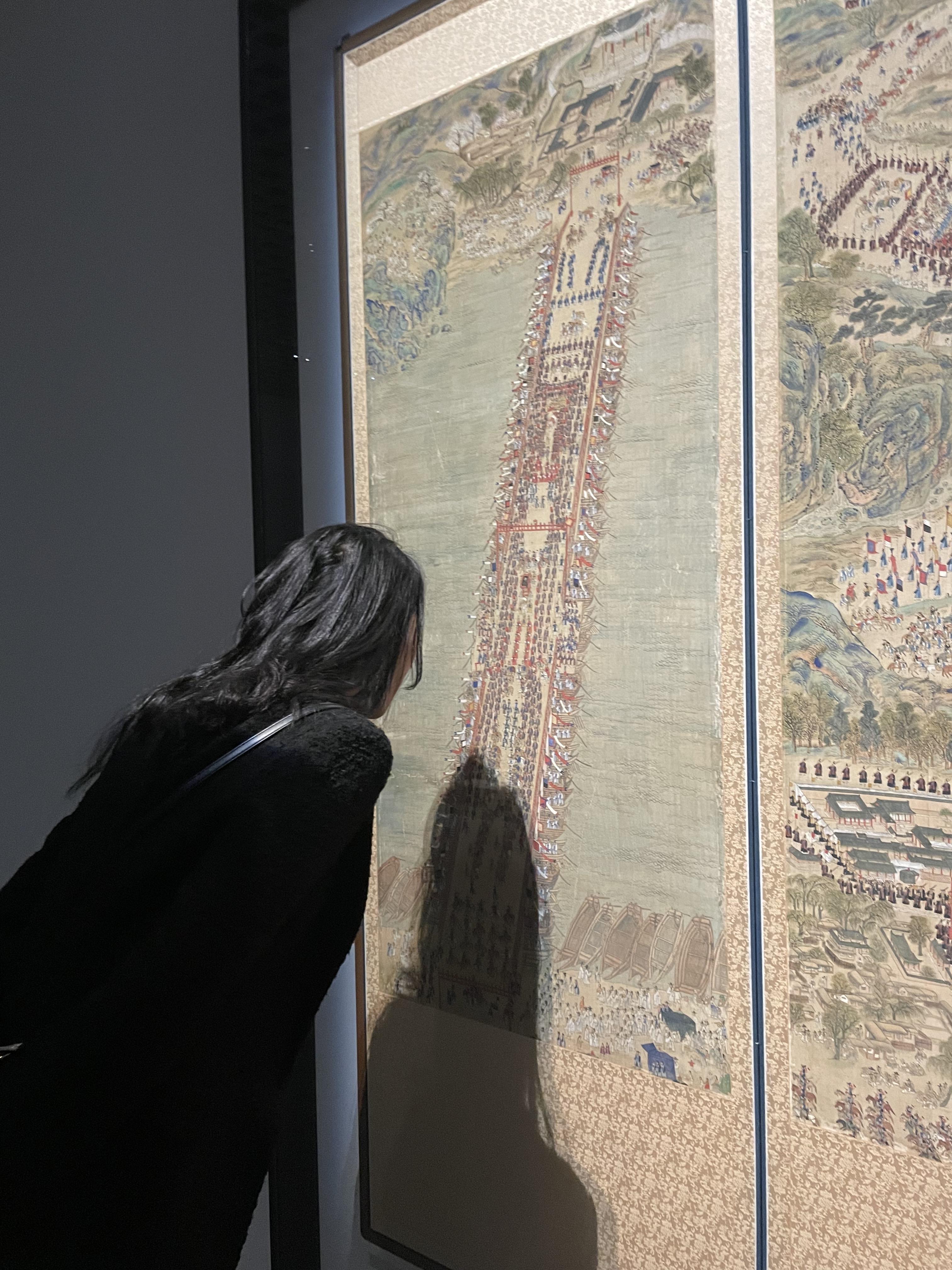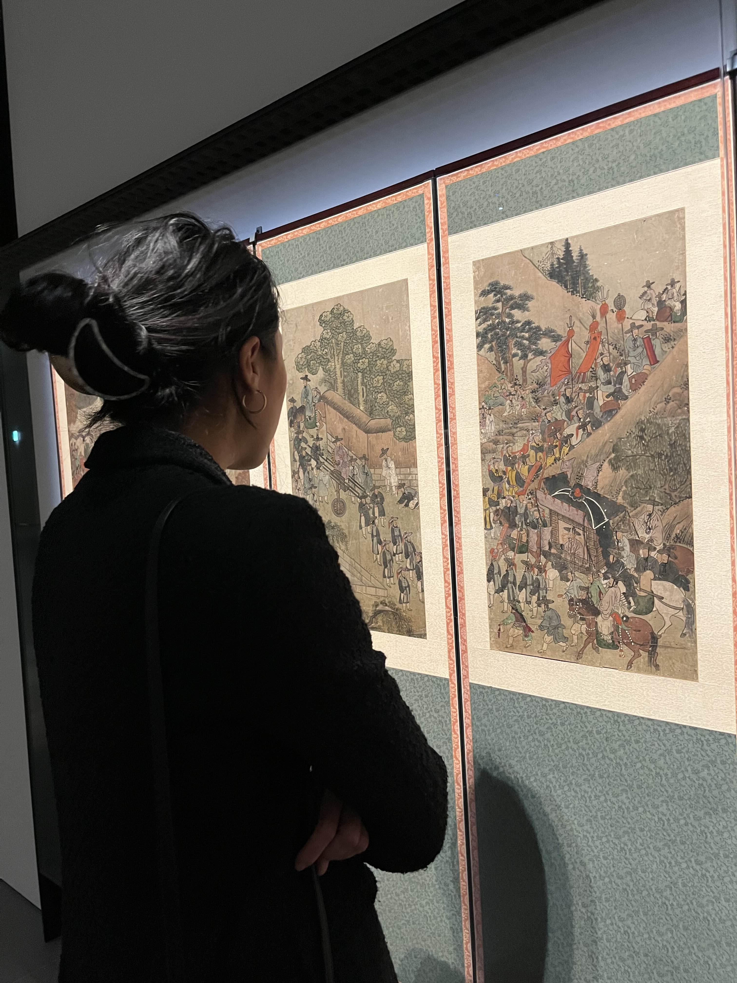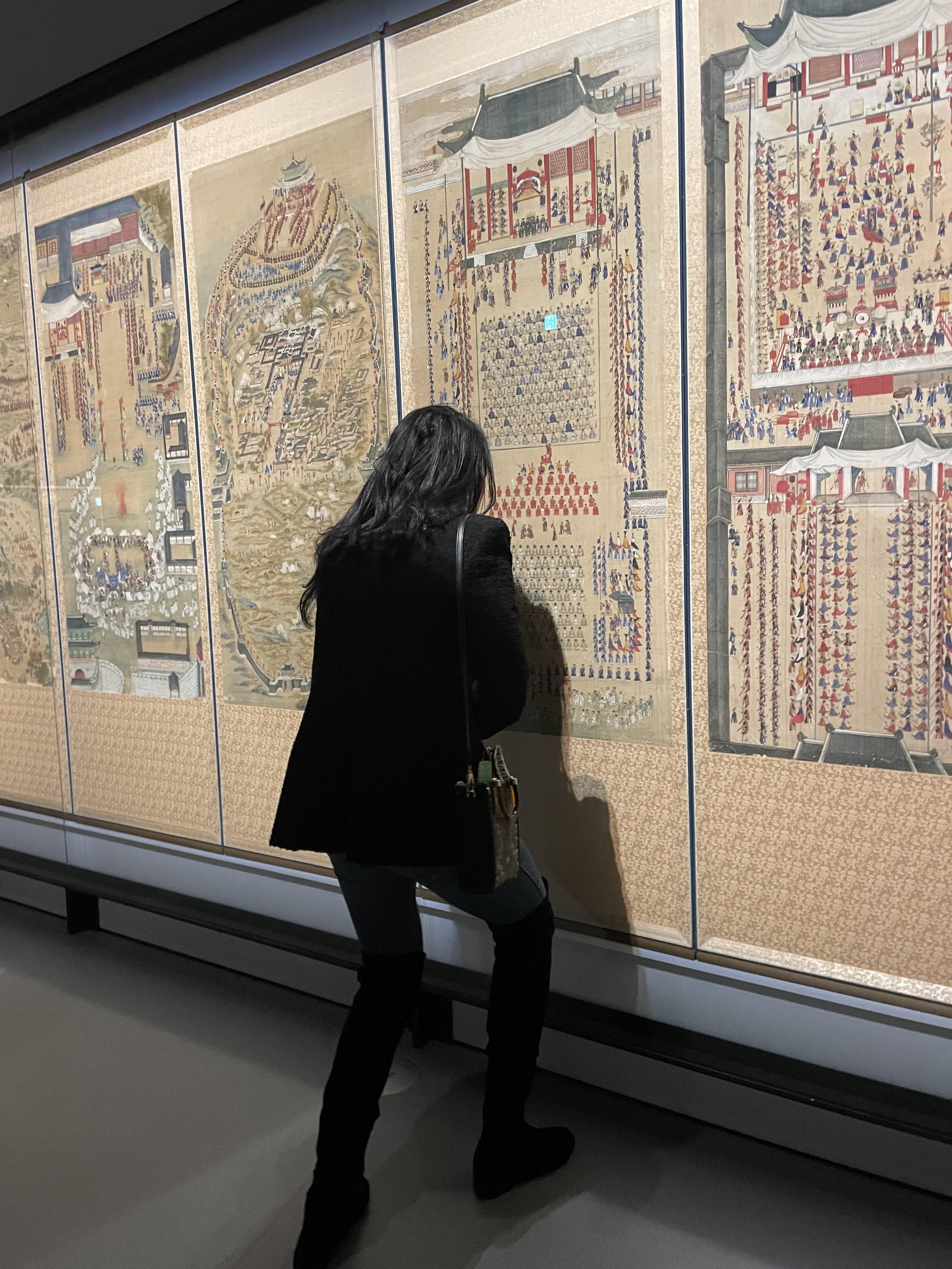 내가 좋아하는 또 다른 병풍. 정조 때 화성행차, 군사훈련, 의례 등 8개의 에피소드들을 모아놓은 병풍이다. 저렇게 가까이에서 자세히 보고싶을 만큼 그림의 디테일이 미쳤다. (앞에 유리로 가림막 되어있어 저정도 가까이 봐도 괜찮습니당 ^.^)