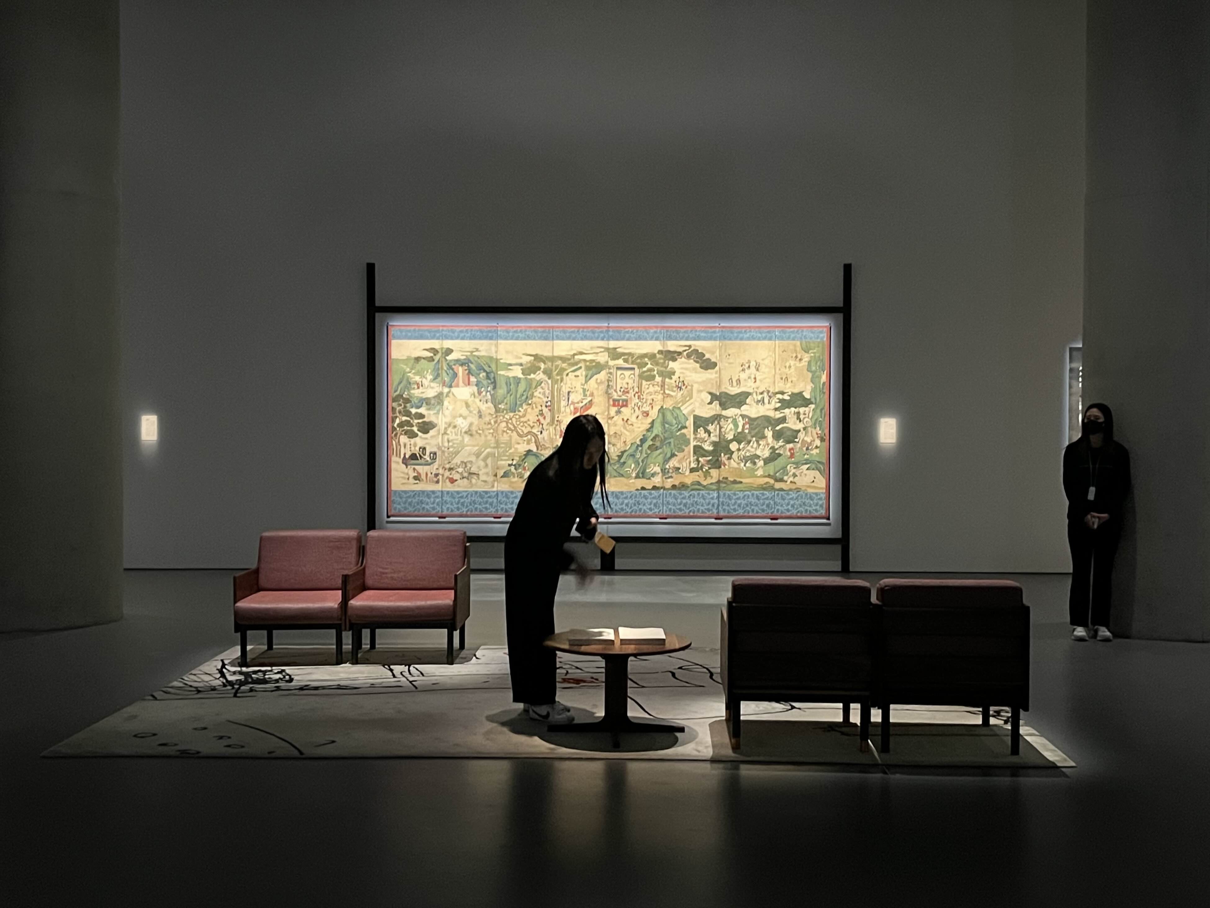 고즈넉한 분위기의 전시관. 멀리서 병풍을 볼 수 있게 의자도 마련되어 있다.
